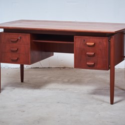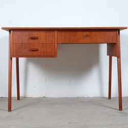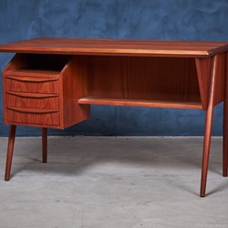 Freestanding desk in teak with good storage room and room for books. The desk has a beautiful look and would be a great addition to any modern office environment. The desk is in great vintage condition.
