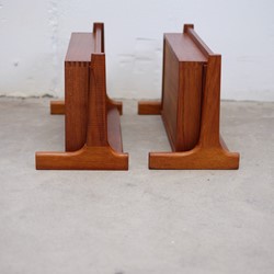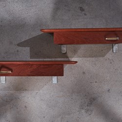 A pair of teak wall mountable floating nightstands. Made in Denmark, circa 1960. Unusual design and in great vintage condition. Very light and elegant design. If you prefer the item will polished and shined before shipping.