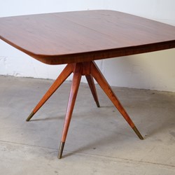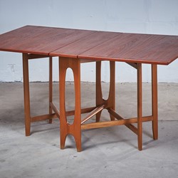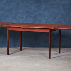 A beautiful teak dining table which is well suited for smaller spaces and proves to be very functional thanks to its two extendable Dutch leaves. The leaves fit nicely under the tabletop and their ends add nicely to the design. This table would make a great addition to any modern dining environment. Each pull out leave is 47cm.