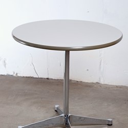 White, round table top with grey vinyl edge on black lacquered and chromed metal base. The table are in good condition.