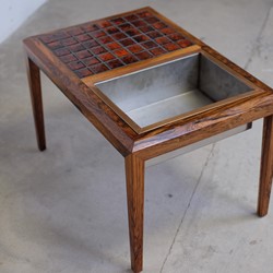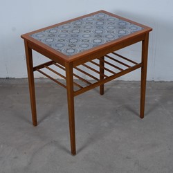The flower table is in a very nice condition and one half of the table is with tiles and the other a metal tray for flowers or whatever you would like to fit in. I haven't been able to find the name of the designer but I'm 100% sure it is Danish design.