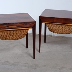 A charming pair of sewing / side tables by Severin Hansen Jr. for Haslev Møbelfabrik. It has a large basket underneath that slides out for wool or yarn storage. They also features a drawer that slides out of the front of the piece for needle, thread or accessory storage. Can easily be used as a side table. The rosewood on both tables are really beautiful and has lots of interesting grain patterns. The legs and solid rosewood. This piece would be a unique addition to any modern environment. Both of the tables are like new!