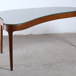 Organic shaped coffee table in nut tree with glass top and brass shoes.