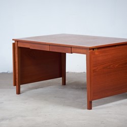 Beautiful free-standing desk in teak with raised edge. Some age-related wear.