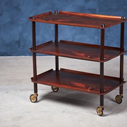 Stunning tray/rolling table in Rosewood by Danish designer Poul Hundevad produced by Vamdrup Møbelfabrik. It is possible to unscrew the table and remove the middle tray. The wheels run really well without any problems. Really well maintained tray table. This model is not often seen as they wasn't in production for a long time. The table features, elegant rosewood grains on the table which gives it a fantastic look and its very high quality and great craftsmanship clearly shows that this is a piece of furniture from the golden age. Danish mid-century 60s design. Gorgeous high quality design pieces that will make a statement in any modern environment.