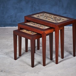 A set of 3 rosewood nesting tables with inlaid tile tops from the 1960s Danish Modern era. Beautiful clean lines with a slender compact form and designed with rails on the underside for easy removal and storage of each table. Ideal for those occasions where an additional side table is required. Additional measurements available upon request.