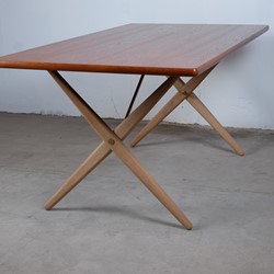 Hunting table with cross-legs in solid oak and tabletop in solid teak. This stunning table is made by Erhard Rasmussen in the 1960s. The table are in good vintage condition and would be a great addition any modern environment, such as hunting room or as lounge table. Very high quality and a great piece from the golden age of Danish design.