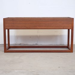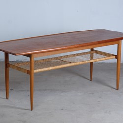 Beautiful table in teak with frame in solid oak. The table features a raised edge on both sides and a underneath shelf with woven cane which are in good condition. Stunning table there would suit virtually any modern living environment.