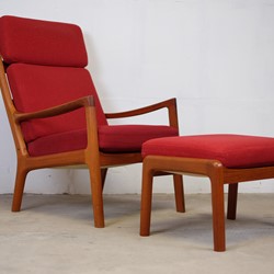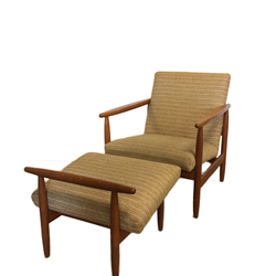 This beautiful chair is not often seen and rare to find as a pair. The chair is made in solid teak, and the flip-out part for the stool is made in solid oak. I'm not sure that the fabric is original, but the condition is useful.