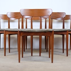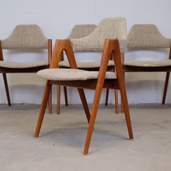 Very beautiful set of six dining chairs by Kai Kristiansen for Korup Stolefabrik. The chairs feature a comfortable curved back in teak with beautiful armrests also in teak. For an extra fee you can get the cover changed at a professional upholsterer just like you like it, in wool, real leather or fabric. The same is possible if you like the chairs sanded and treated with something at a professional carpenter.