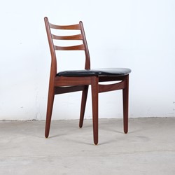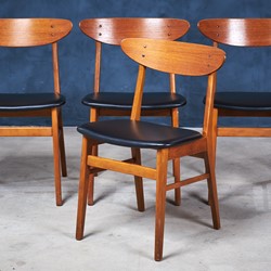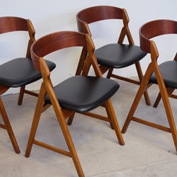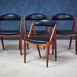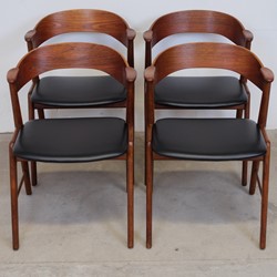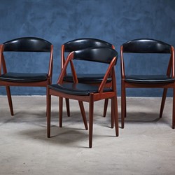 A beautiful set of four teak dining chairs by Kai Kristiansen. The comfortable and timeless Danish Classic, 'model 31'. Produced in Denmark, circa 1960. These four chairs is upholstered with artificial leather on seat and back which are in good vintage condition with no holes or deep scratches. These chairs would be a great addition to any dining room environment.