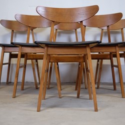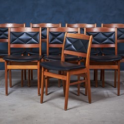Set of eight mid-century dining chairs in teak. Danish design from the 1950s. The chairs has an elegant look with seat and back in artificial leather. Great seating comfort. The chairs are in good vintage condition with small traces of age and use. This set would be a great addition to any modern dining room area.