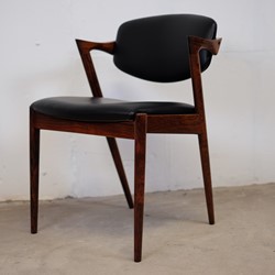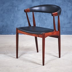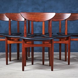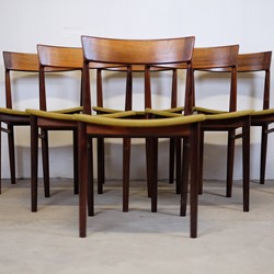 This is a stunning set of six rosewood dining chairs by the Danish designer Kai Kristiansen. When walking into a room, this chair cannot help but grab ones attention with its striking design. The model has an elegant and light design and all the best qualities of good Danish craftsmanship and on top of that, a really good seating comfort.
