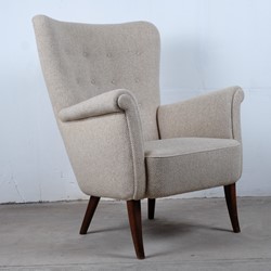 This must be one of the finest, most comfortable and beautiful chairs we have in our collection. This chair can not hide its beauty from any angles. The chair got grey/beige colored wool, a beautiful cross-frame in solid teak and nails also in solid teak that looks very similar like those on Hans Wegner's 'Papa bear' chair . Unfortunately we have not been able to find the designer of this chair, even after many hours of searching. But it is with certainty from the 60s era of Danish design.