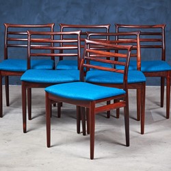 Absolutely stunning set of six dining chairs in rosewood designed by Erling Torvits for Sorø Stolefabrik, circa 1960s. Beautiful organic sculpted seat backs and clean lines. The chairs has been to an carpenter and has been polished and also got new blue quality fabric with texture by a professional reupholster. In great condition with only a few small scratches caused by age-related use. This set would make a great addition to any modern dining environment.