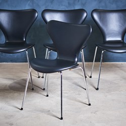 A set of four Seven chairs, model 3107, designed by Arne Jacobsen and manufactured by Fritz Hansen in the 1980s. The chairs are upholstered in black classic leather. Danish design by Arne Jacobsen at his best! We can upholster more chairs if needed, in any leather wanted.