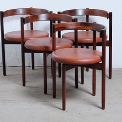 This very beautiful set of four minimalistic dining chairs was made in the 1960s and been in the same home since they were bought, very well kept and in very good condition. The chairs has 'cognac' artificial leather which also are in good condition, with few signs of age related wear. They feature frames made from really beautiful rosewood.