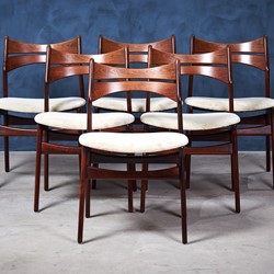 A set of six Rosewood dining chairs Model 310 by Erik Buch and produced at Christian Christensens Møbelfabrik - gently restored, in really good original vintage condition. Elegant with soft, organic lines and the curvature of the rosewood backrest and the rosewood frame supports the human body perfectly, making it an extremely comfortable dining chair. It would add style and class to any dining room.The Model 310 chair is a beautiful example from the Danish modern era, constructed of solid rosewood frame with curved rosewood backrest and floating seat.