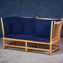 This model 1789 spoke-back sofa was designed by the Danish designer Børge Mogensen. It features a solid beech frame and has been reupholstered with Comfort fabric 'Gabriel', color code 00040. It was designed in 1945 but was first produced in 1963. This sofa was made in 1984 by Fritz Hansen in Denmark. The fabric is easy to clean and can be wiped over with a wet cloth.