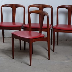 Set of four beautiful ladies! 'Juliane' chairs in teak by one of our greatest designers. This Danish mid-century chair was designed by Johannes Andersen for Vamo Møbelfabrik during the 1960s. The teak frame is in a beautiful organic design with incredibly details. The seats are padded with red leather seats.