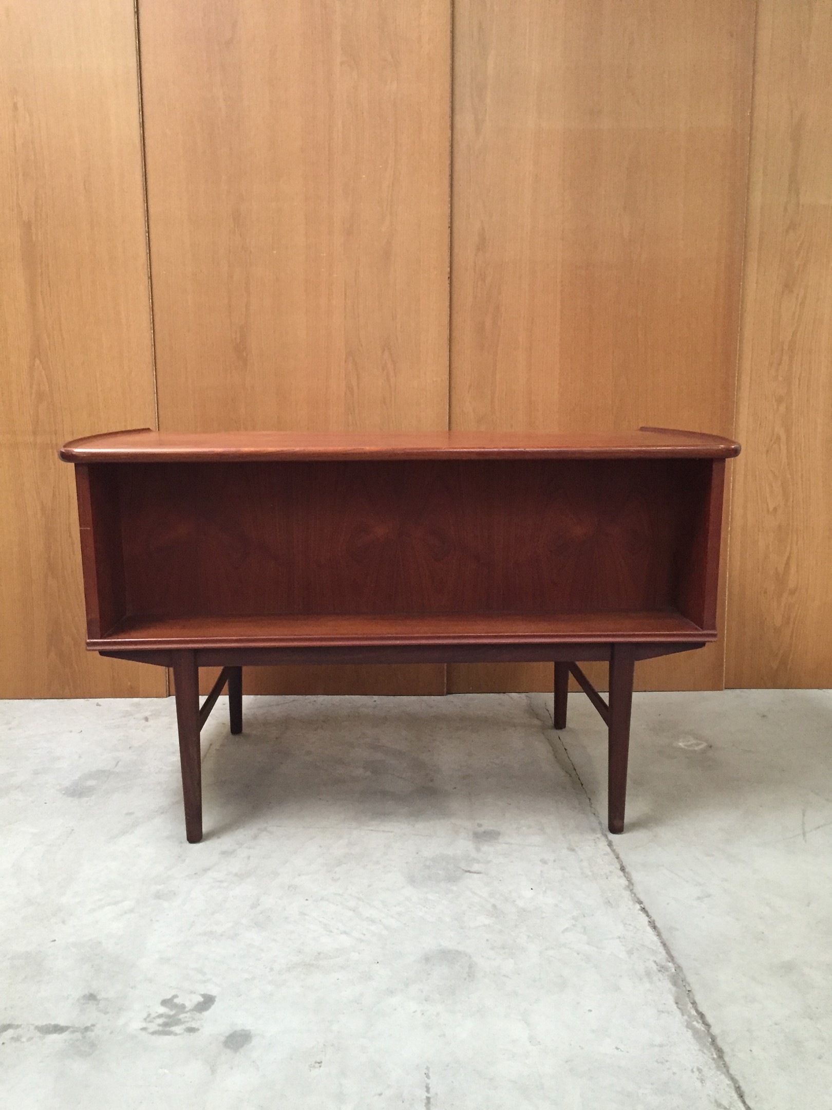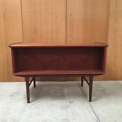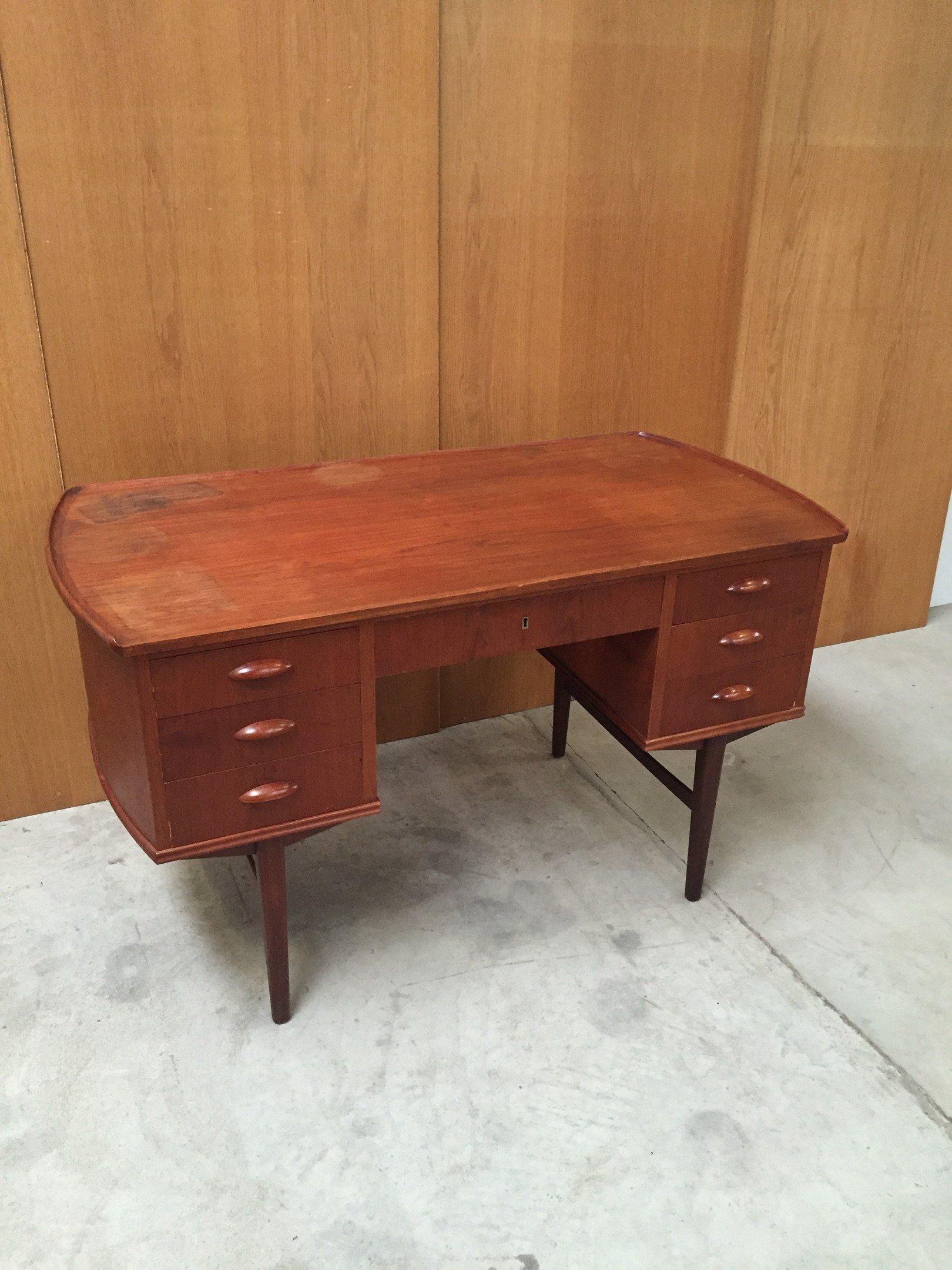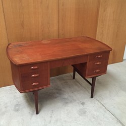 Beautiful free-standing desk in teak with raised edge. Some age-related wear.