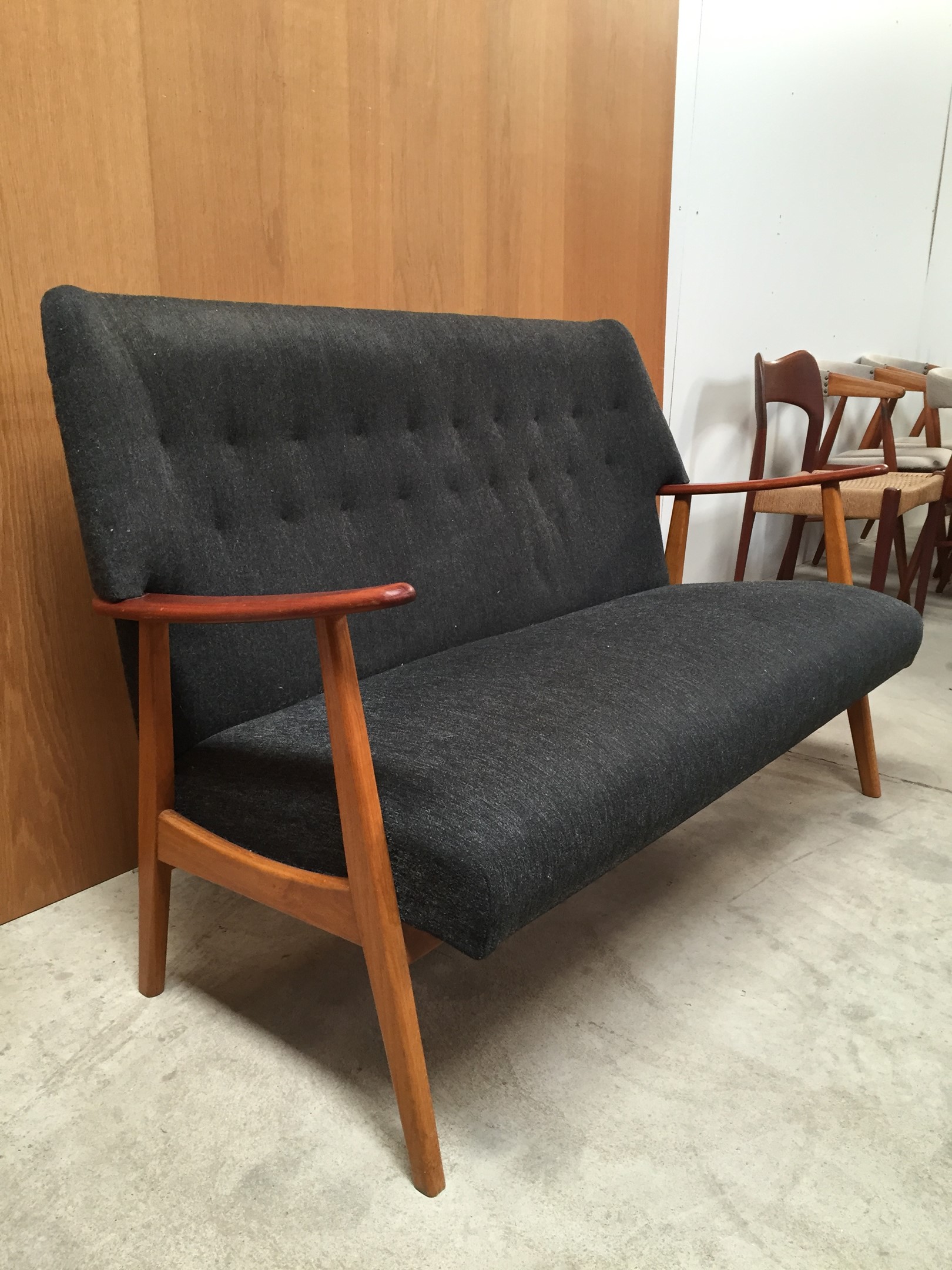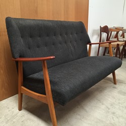 The sofa has armrests in teak and frame in beechwood.