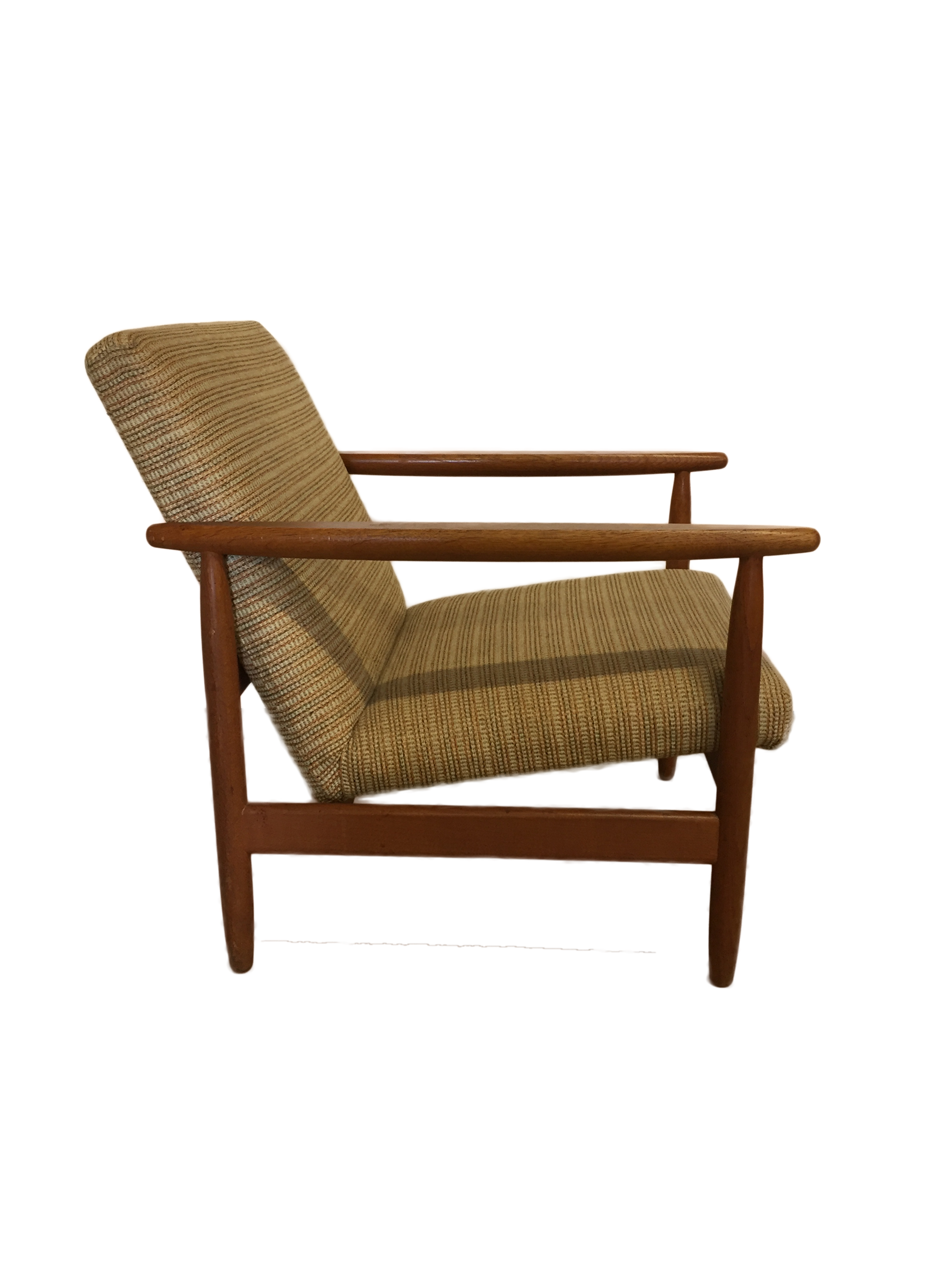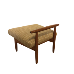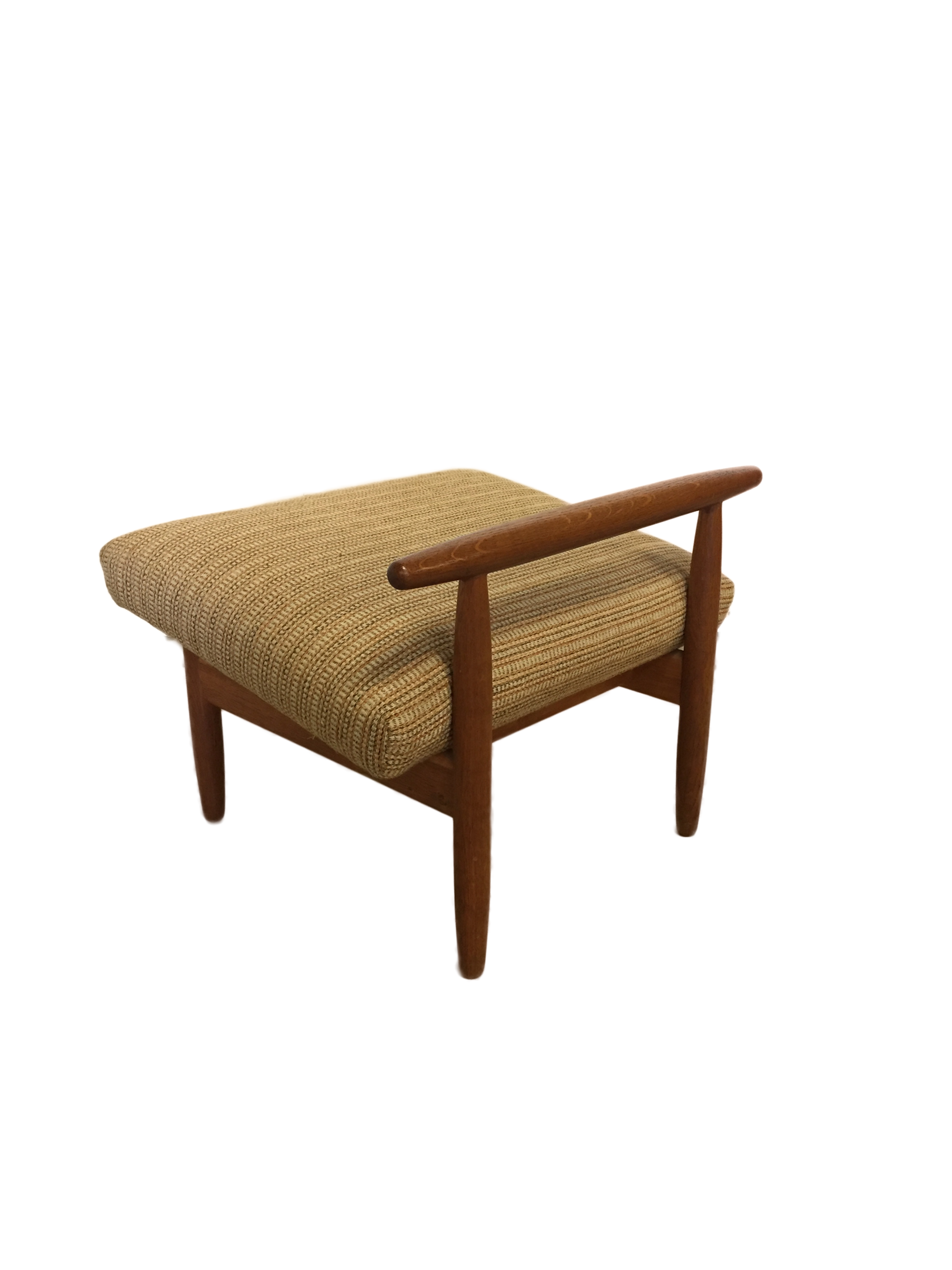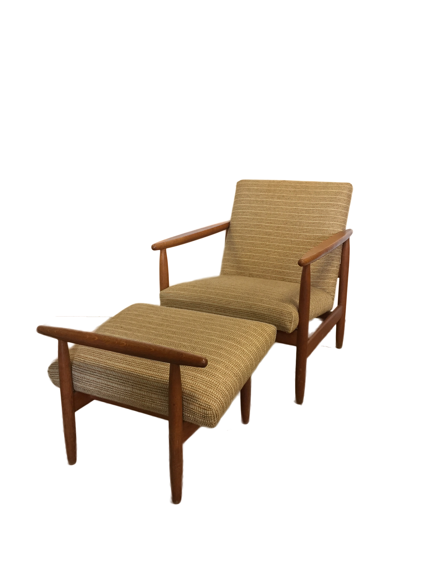 Armchairs and stool with frame in patinated oak, upholstered in wool.