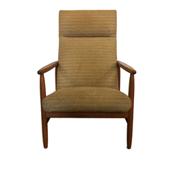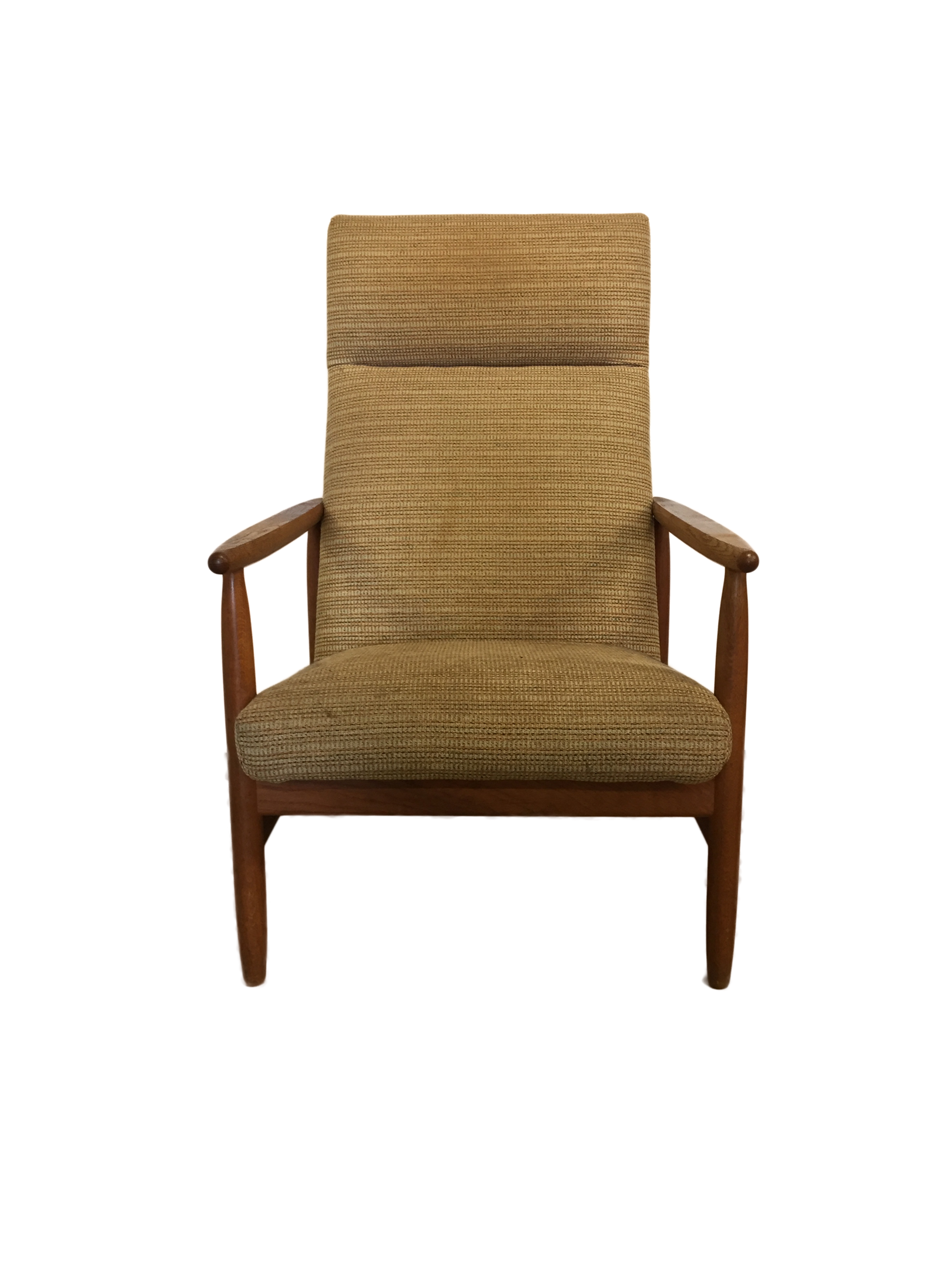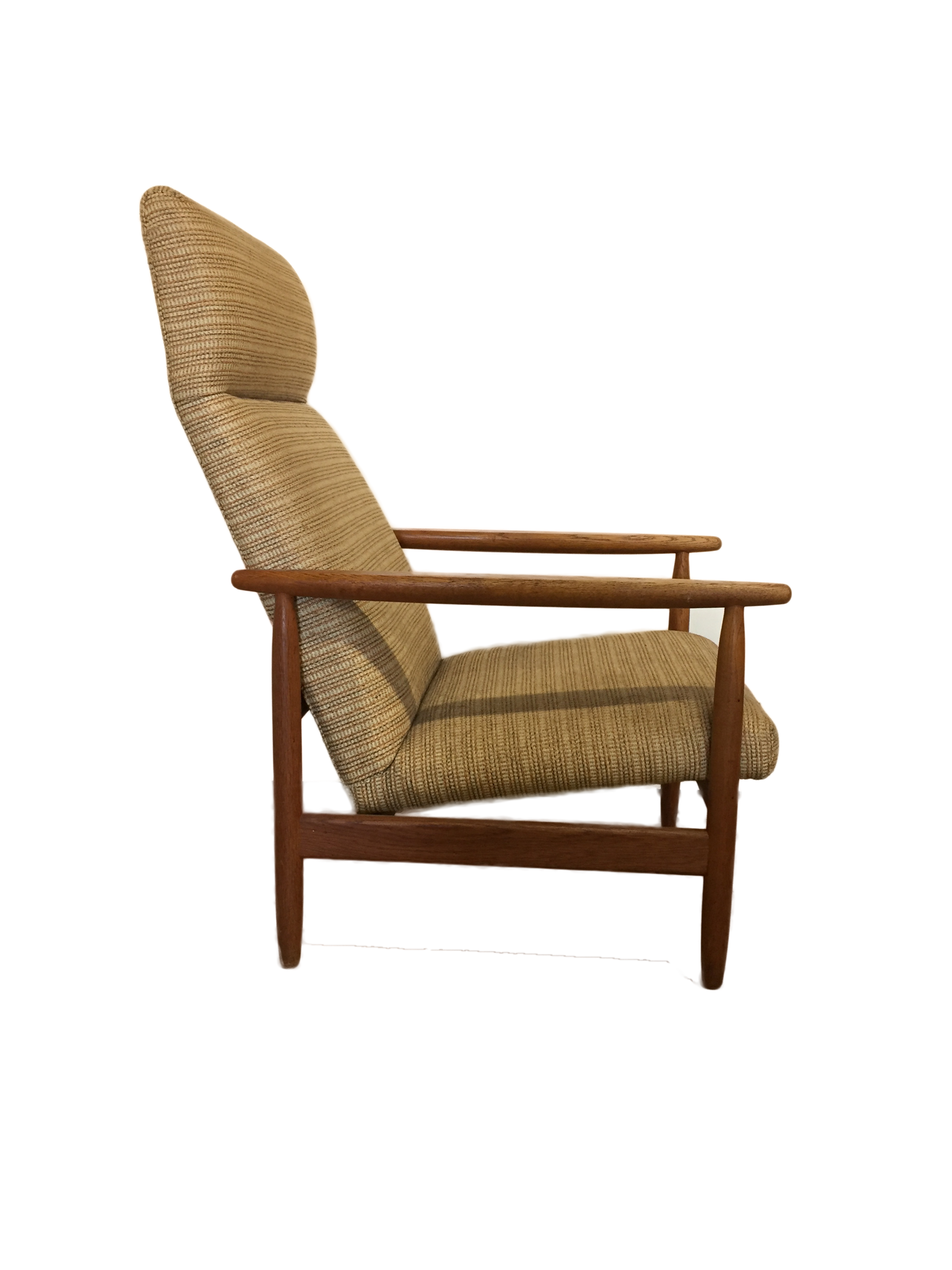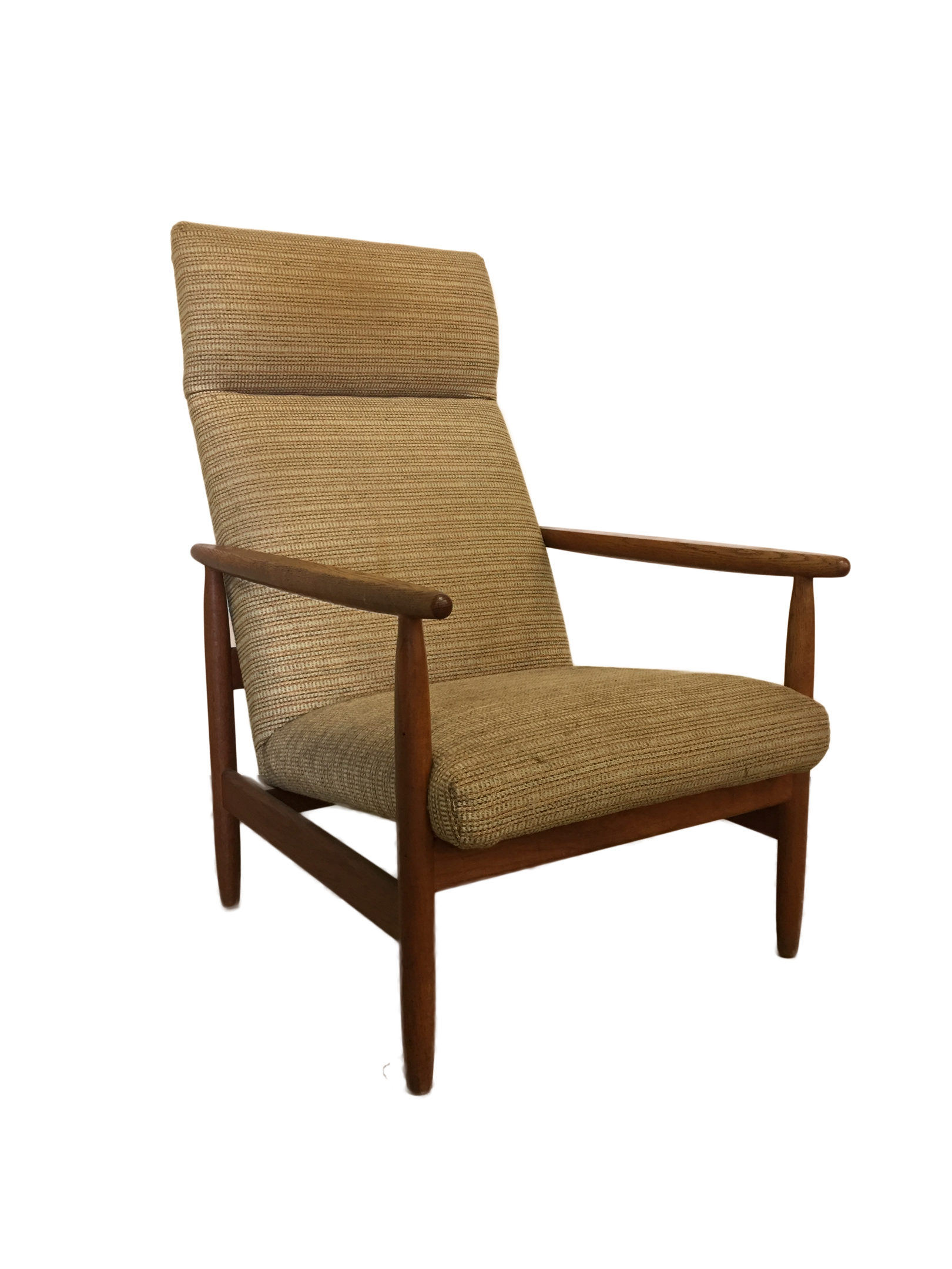 Armchairs and stool with frame in patinated oak, upholstered in wool.