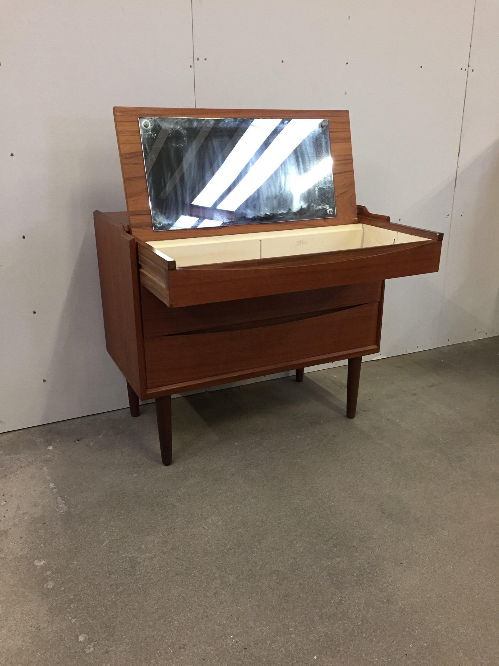 For your consideration a very rare and hard to find secretary/vanity/desk/dresser in teak wood. The top section, pull out to give plenty space for a desk, underneath there is a vanity with original mirror and large storage space.