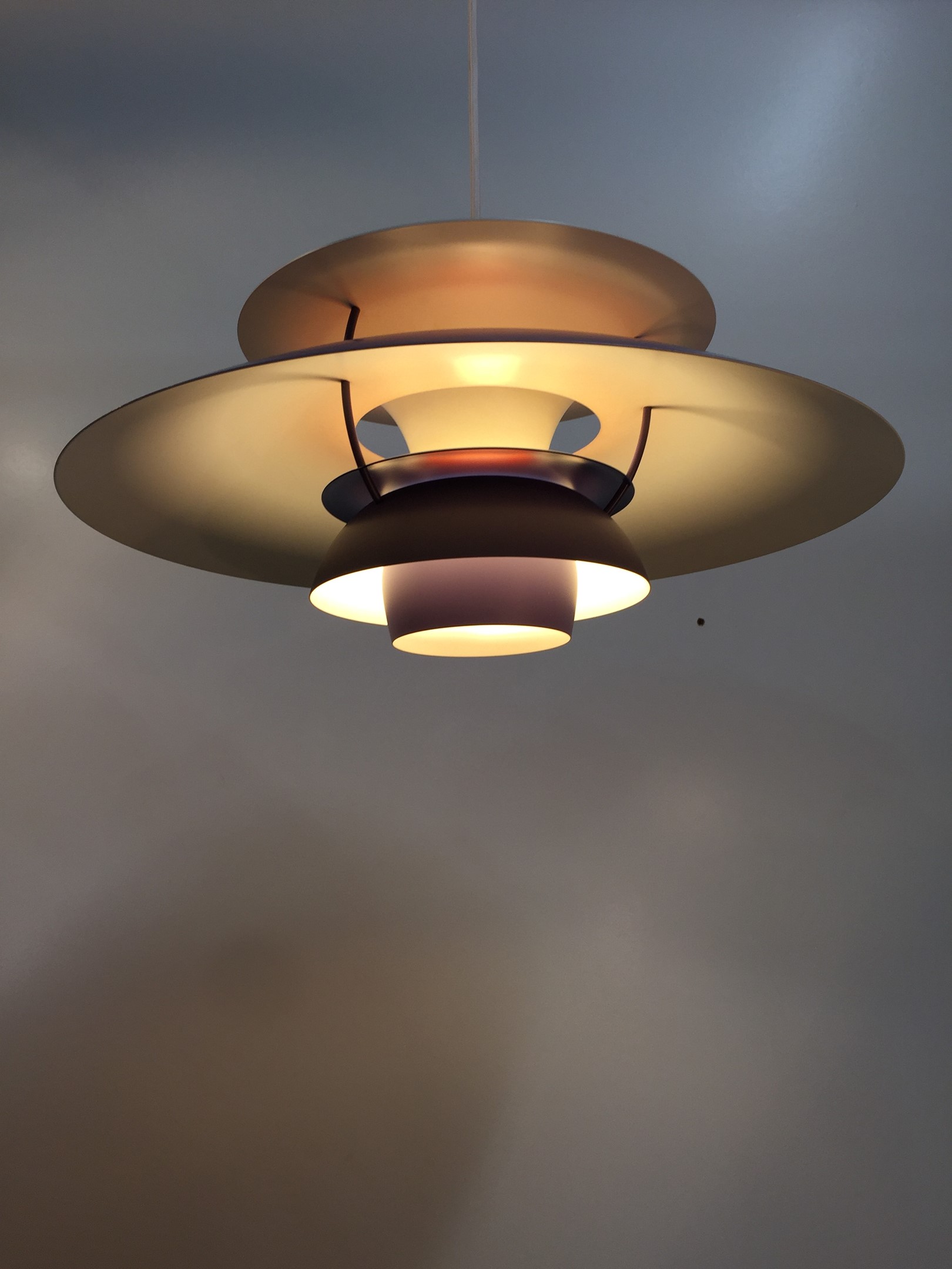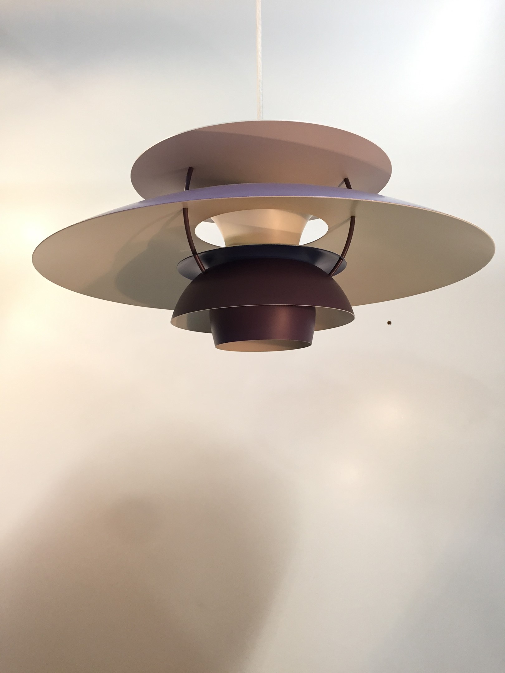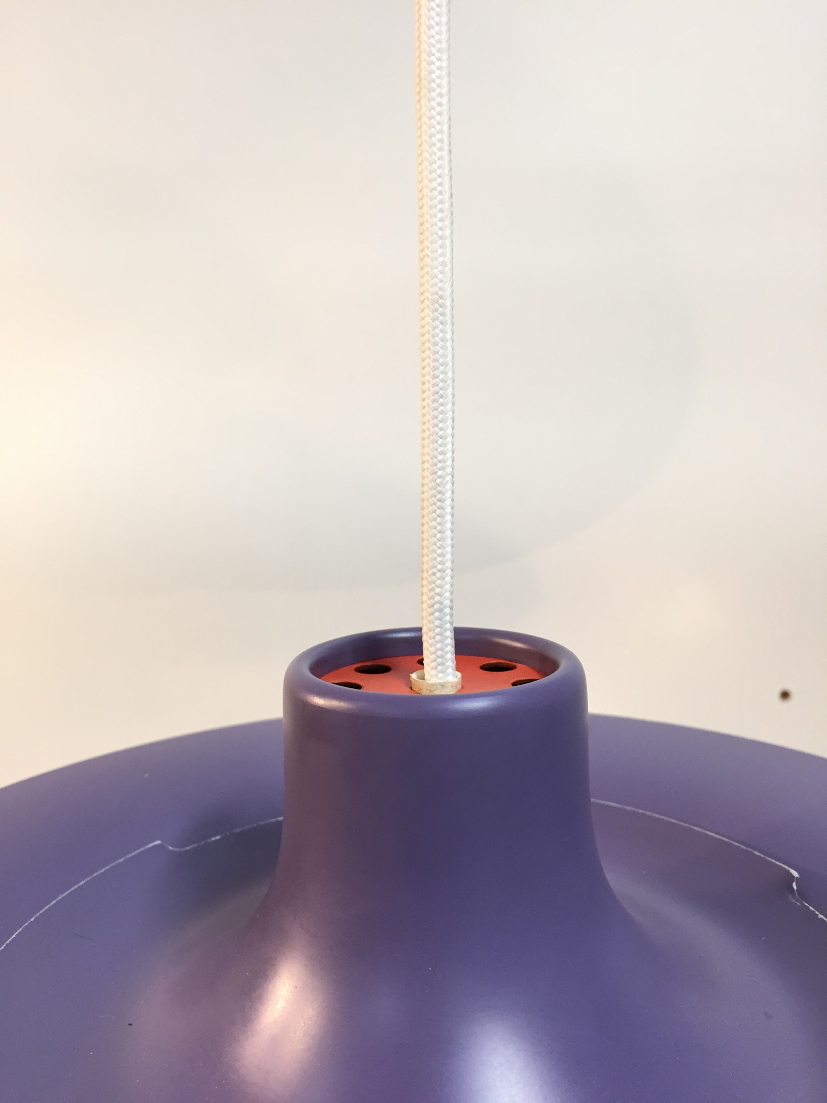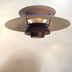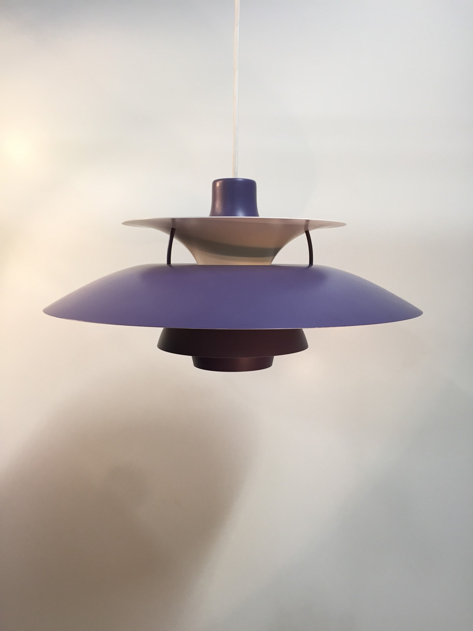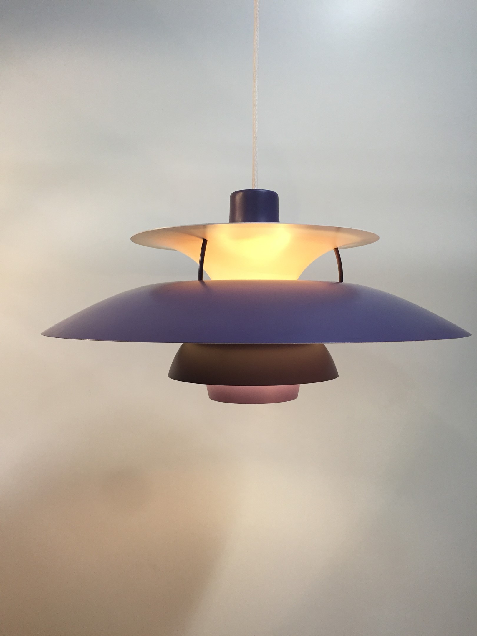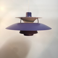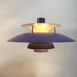 Designed in 1958 by Poul Henningsen for Louis Poulsen, this revolutionary lamp was designed with the home in mind. The purple and white banding diffuses light for a soft, warm tone.