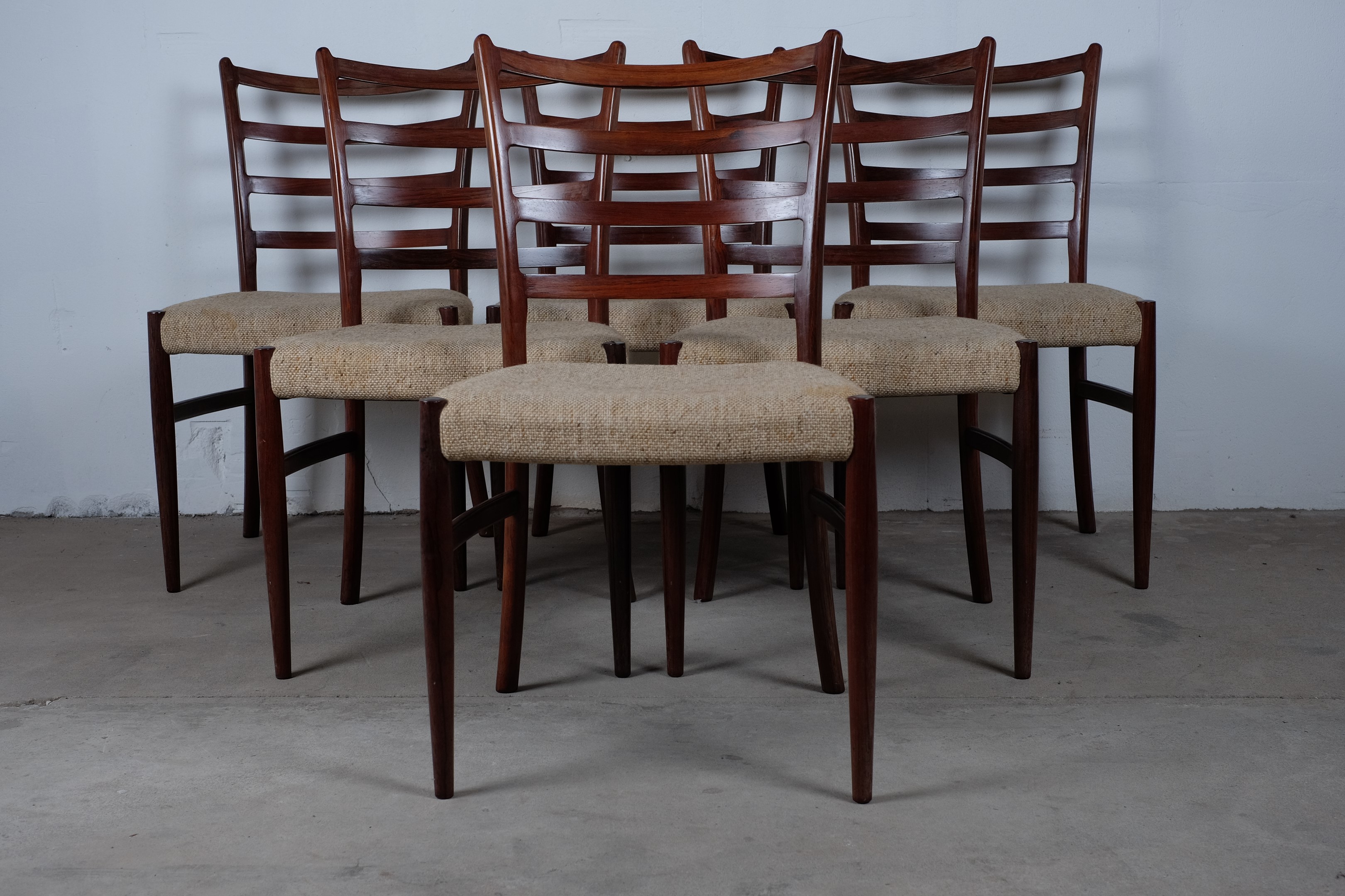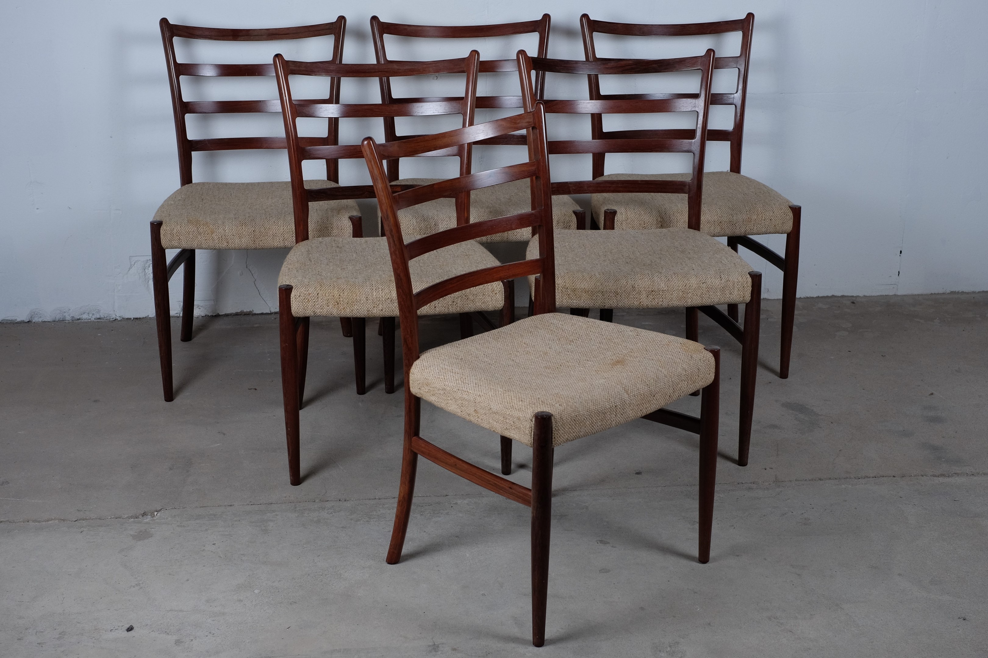Set of 6 rosewood dining chairs witg grey/beige wool.