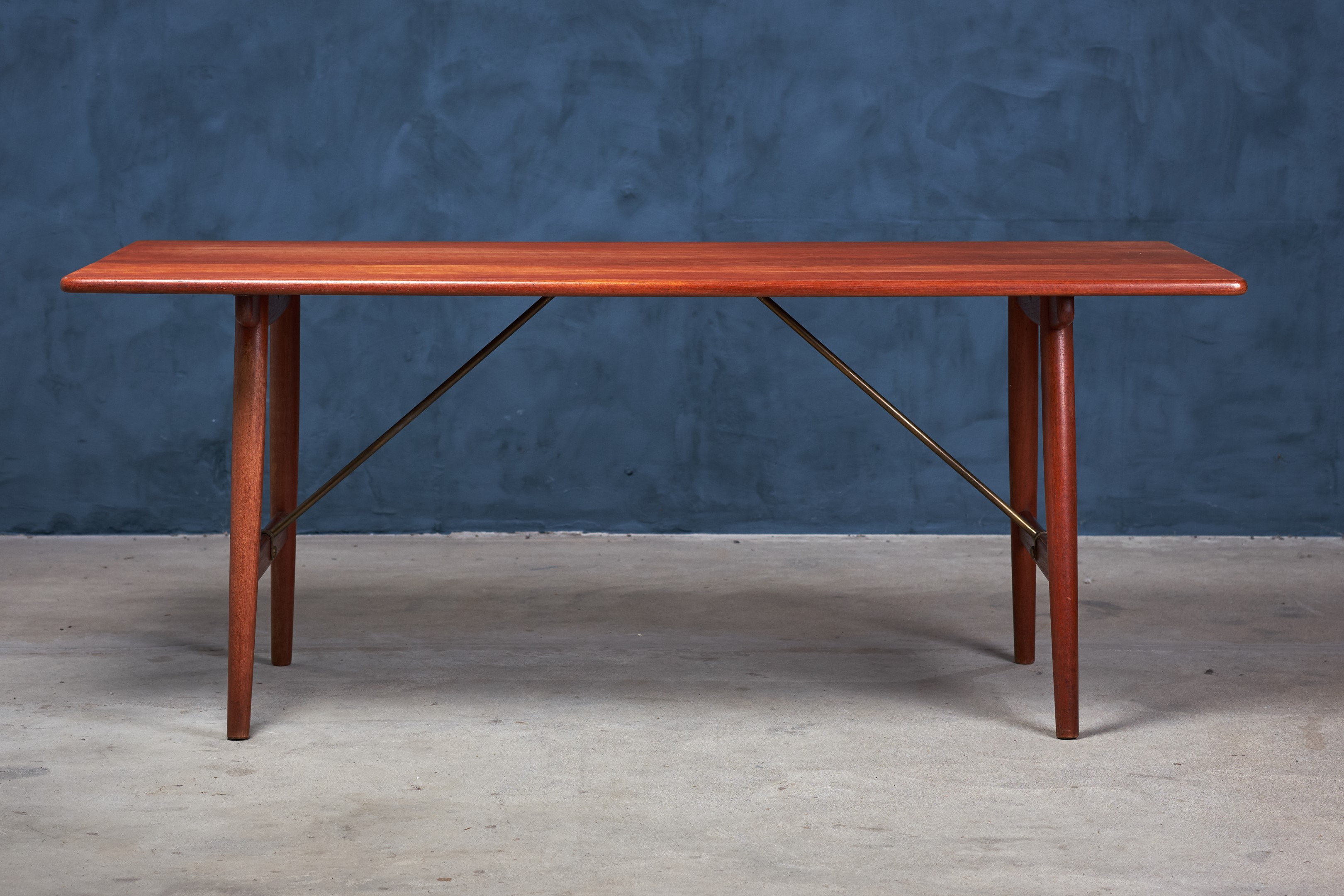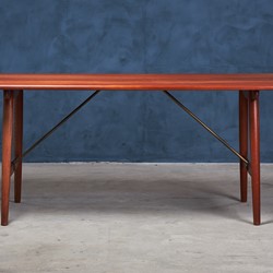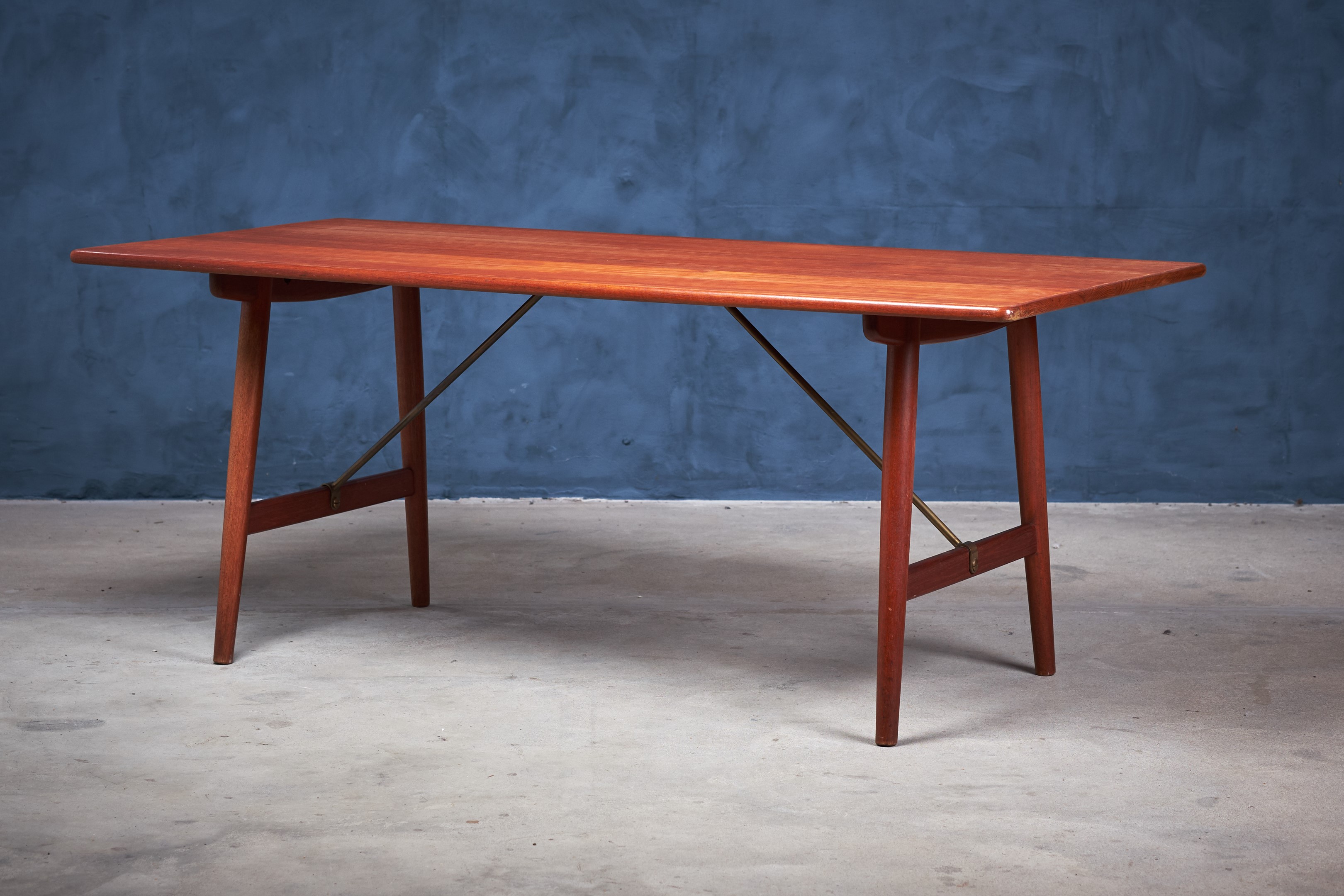 Hunting table with cross-legs in solid oak and tabletop in solid teak. This stunning table is made by Erhard Rasmussen in the 1960s. The table are in good vintage condition and would be a great addition any modern environment, such as hunting room or as lounge table. Very high quality and a great piece from the golden age of Danish design.