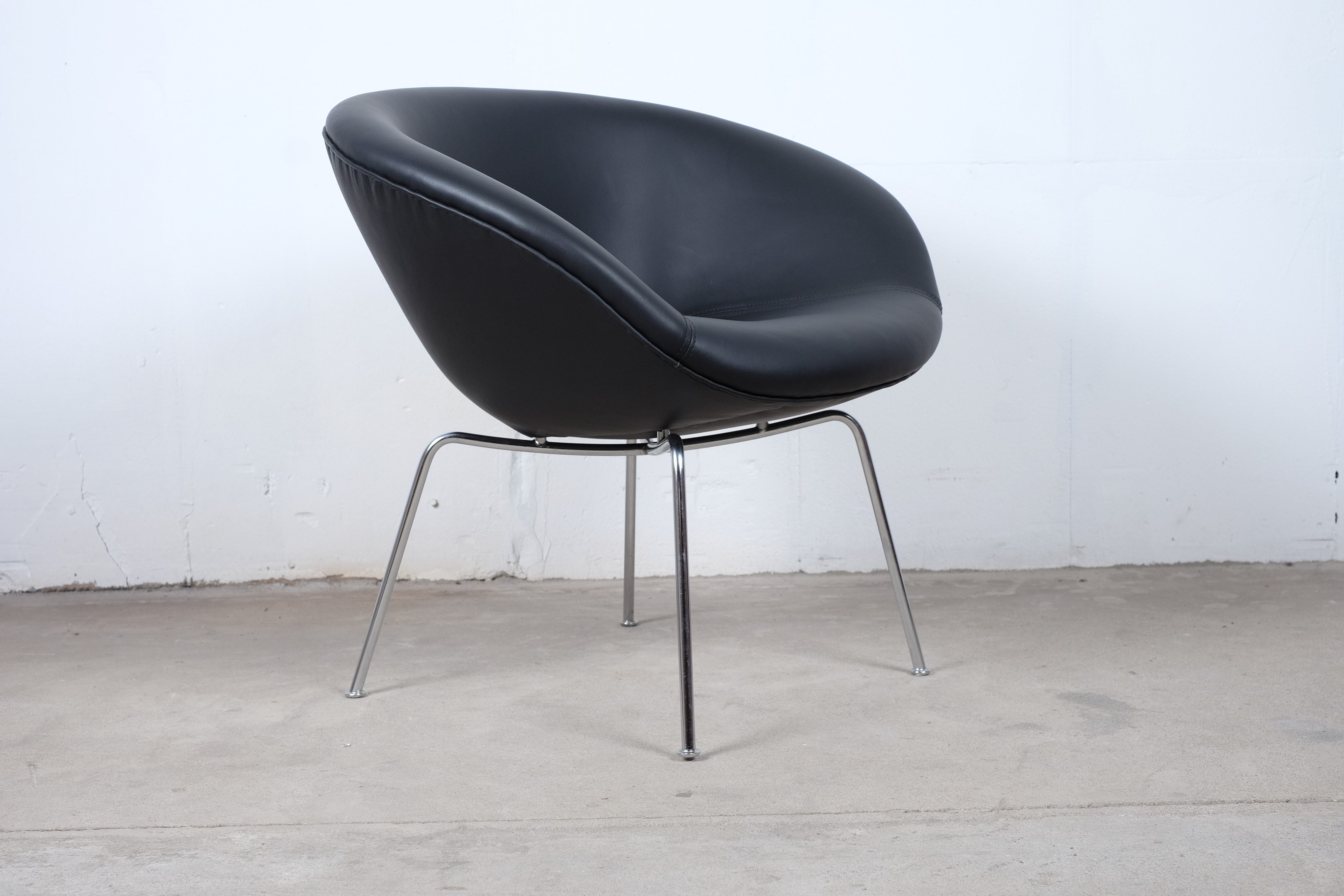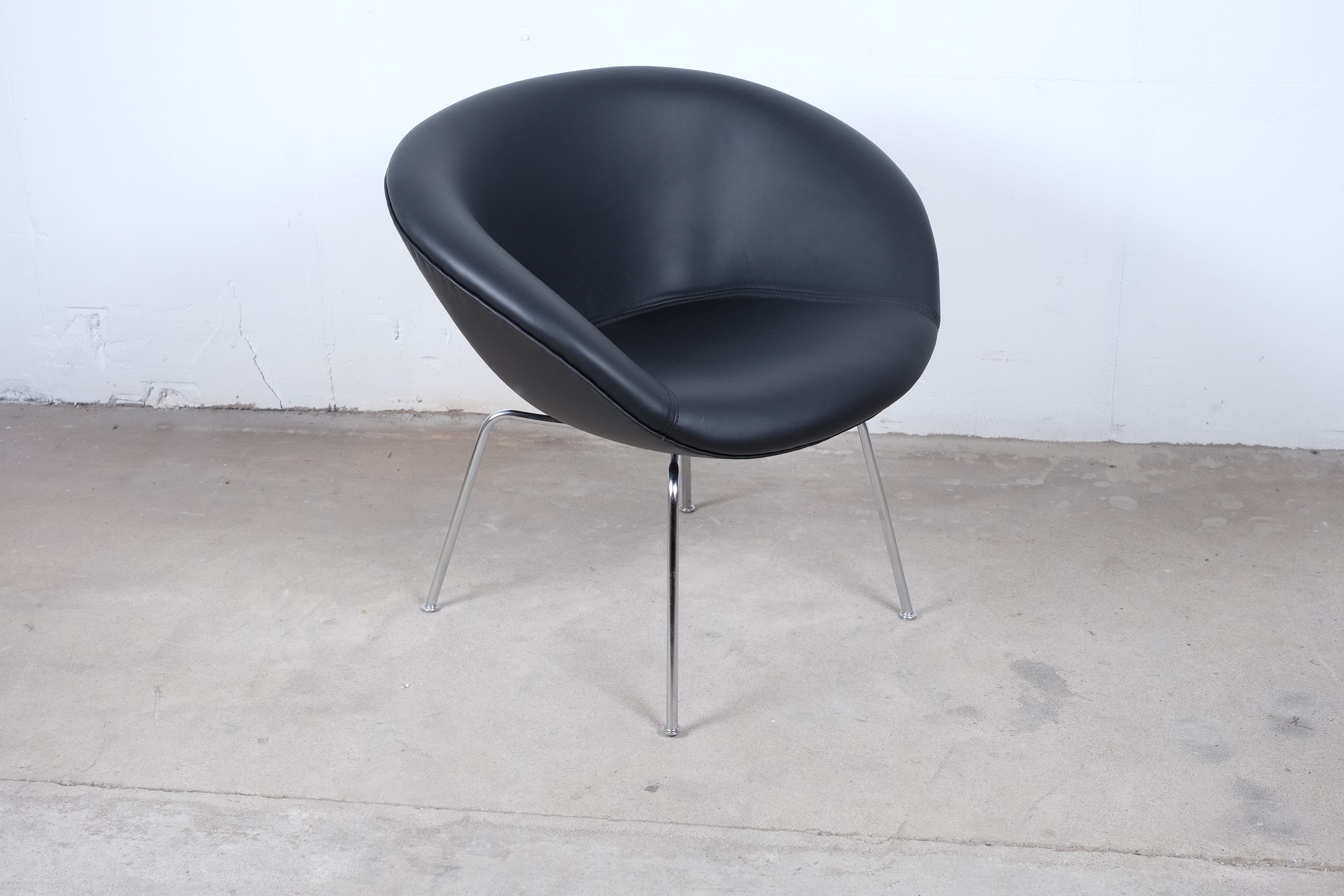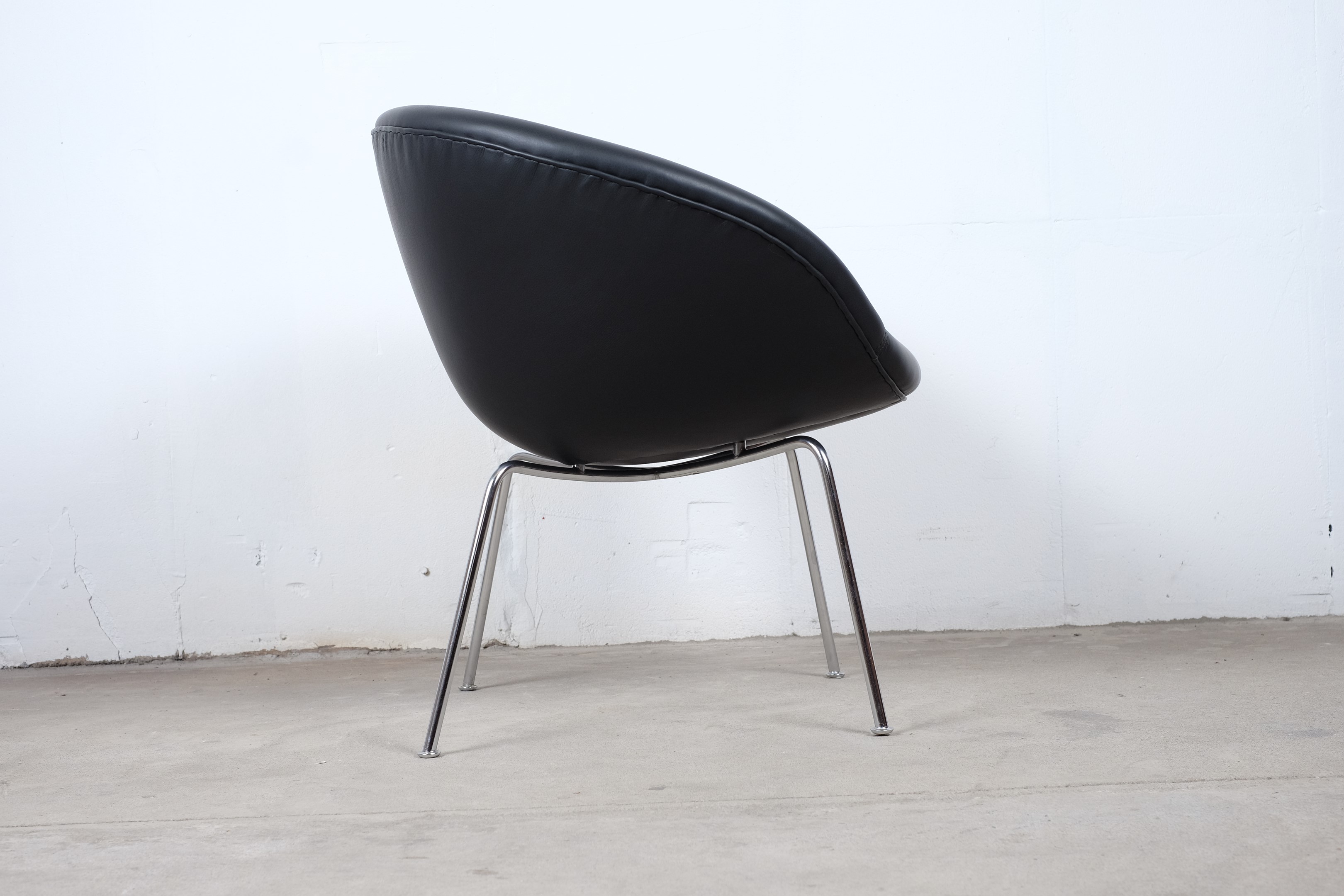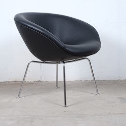 A stunning pot chair model number 3318 designed by Arne Jacobsen for Fritz Hansen in the 1950s. Reupholstered with black leather on chromed tubular steel legs, all in an excellent original condition.