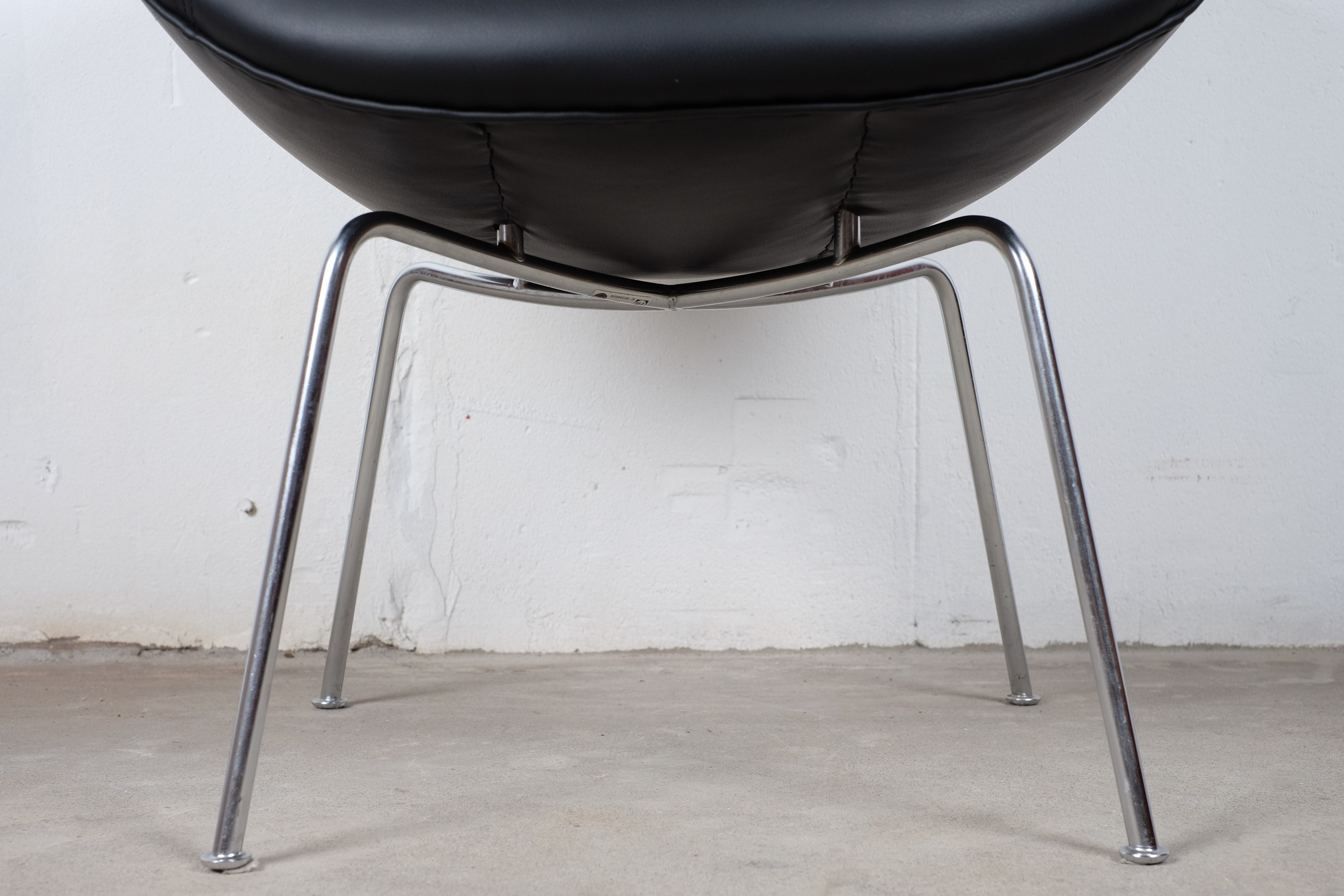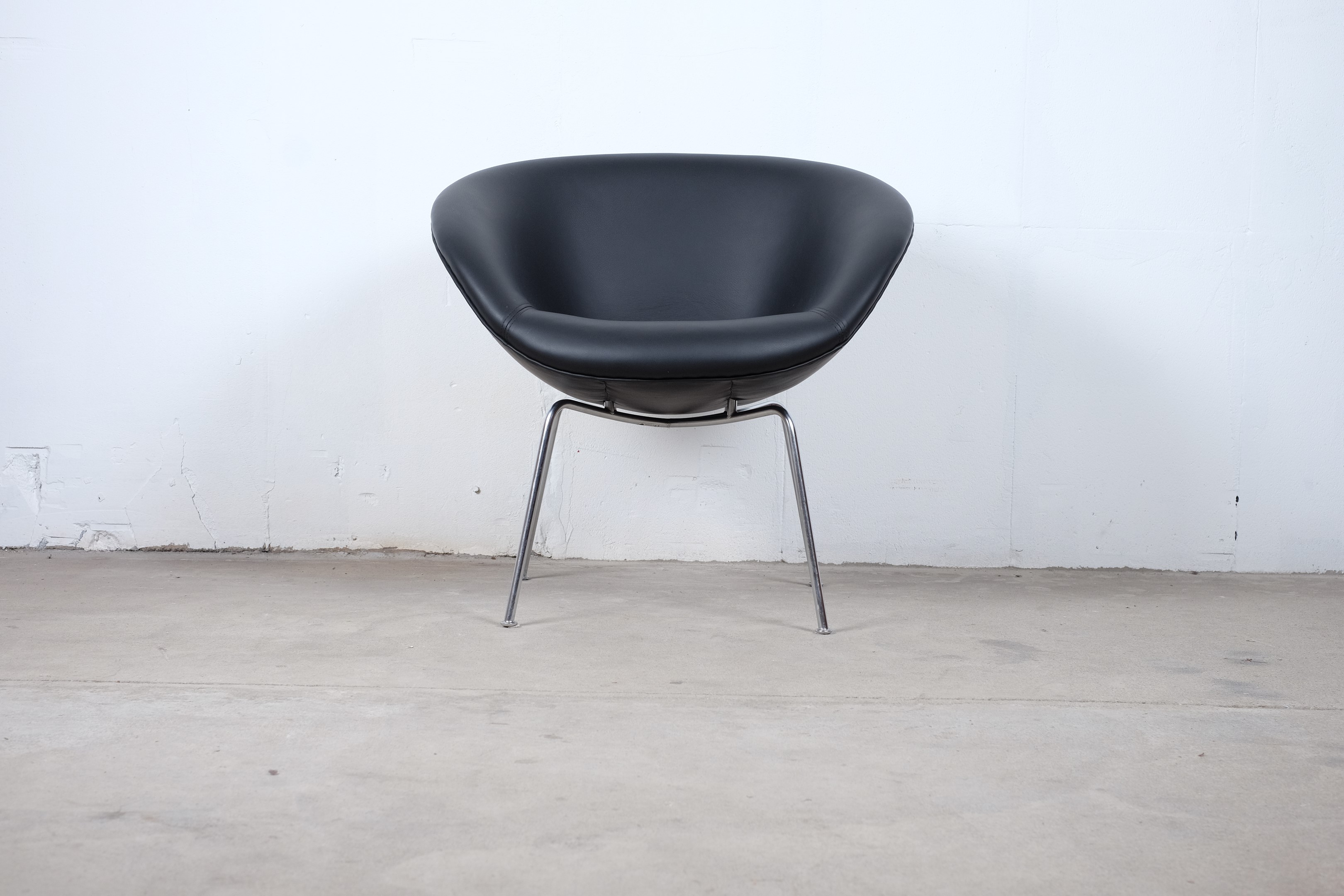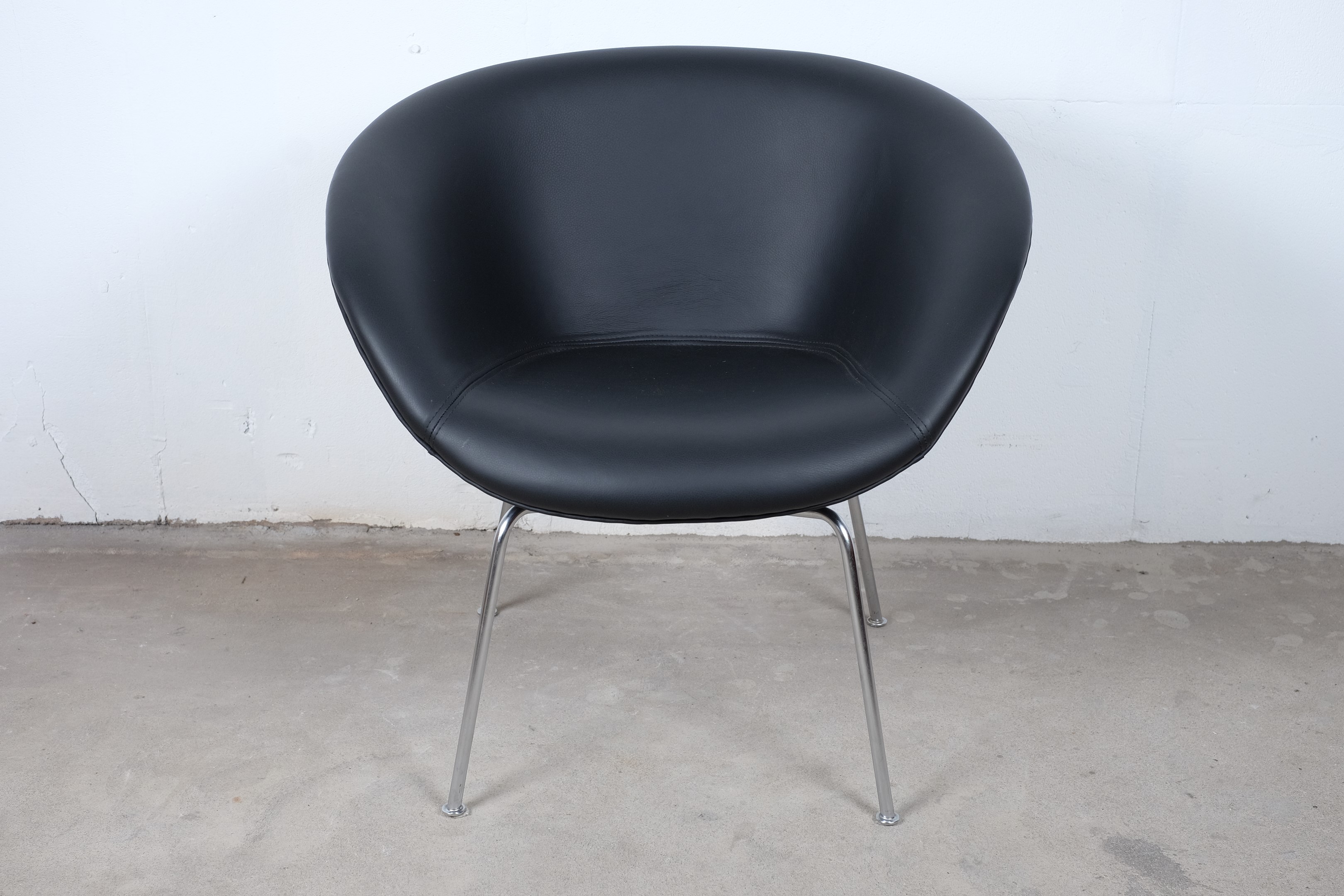 A stunning pot chair model number 3318 designed by Arne Jacobsen for Fritz Hansen in the 1950s. Reupholstered with black leather on chromed tubular steel legs, all in an excellent original condition.