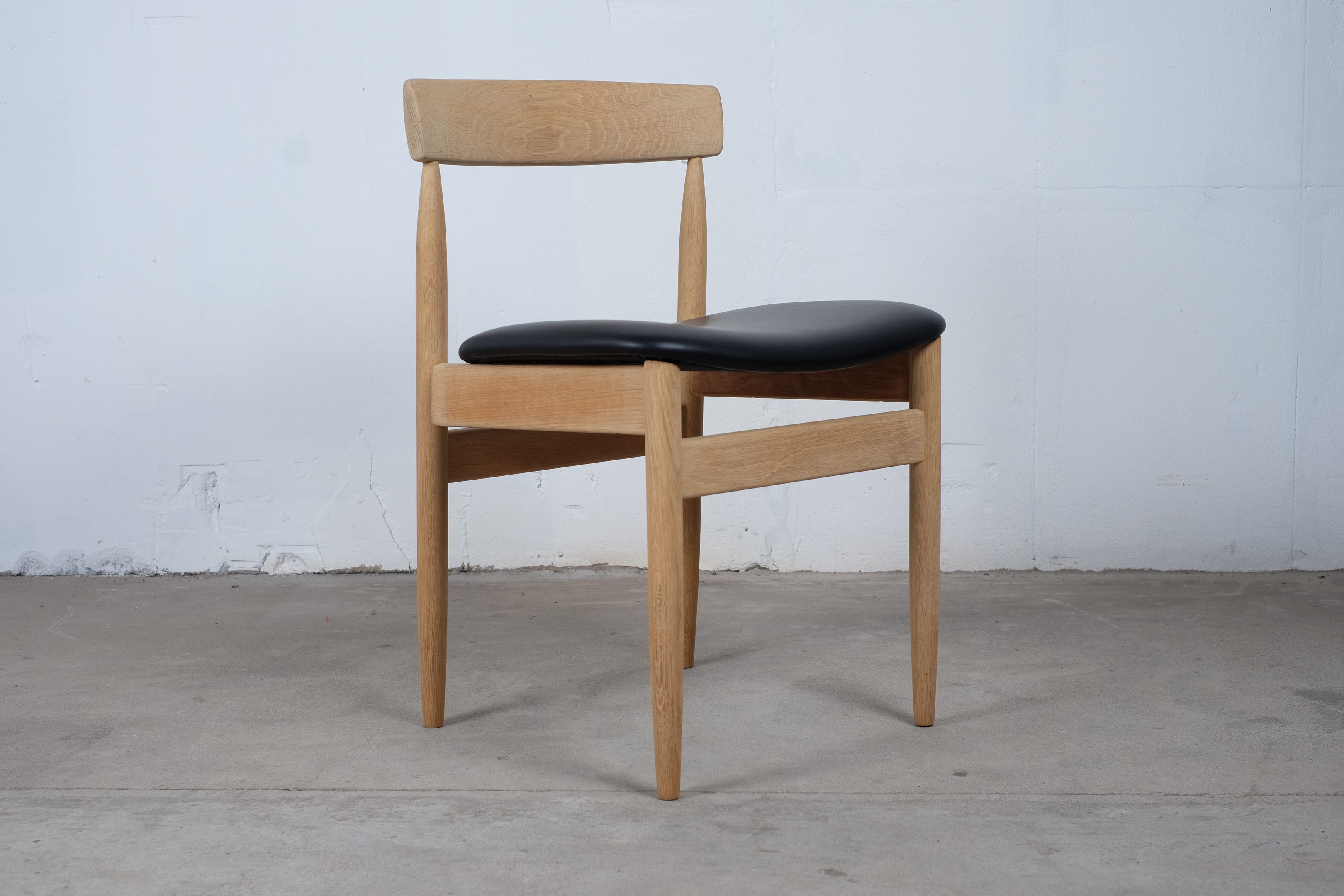 Beautiful set of four vintage dining chairs in solid oak, reupholstered with black leather. The chairs is furniture controlled and 'Made in Denmark' stamp but I haven't been able to find the designer of this chair.