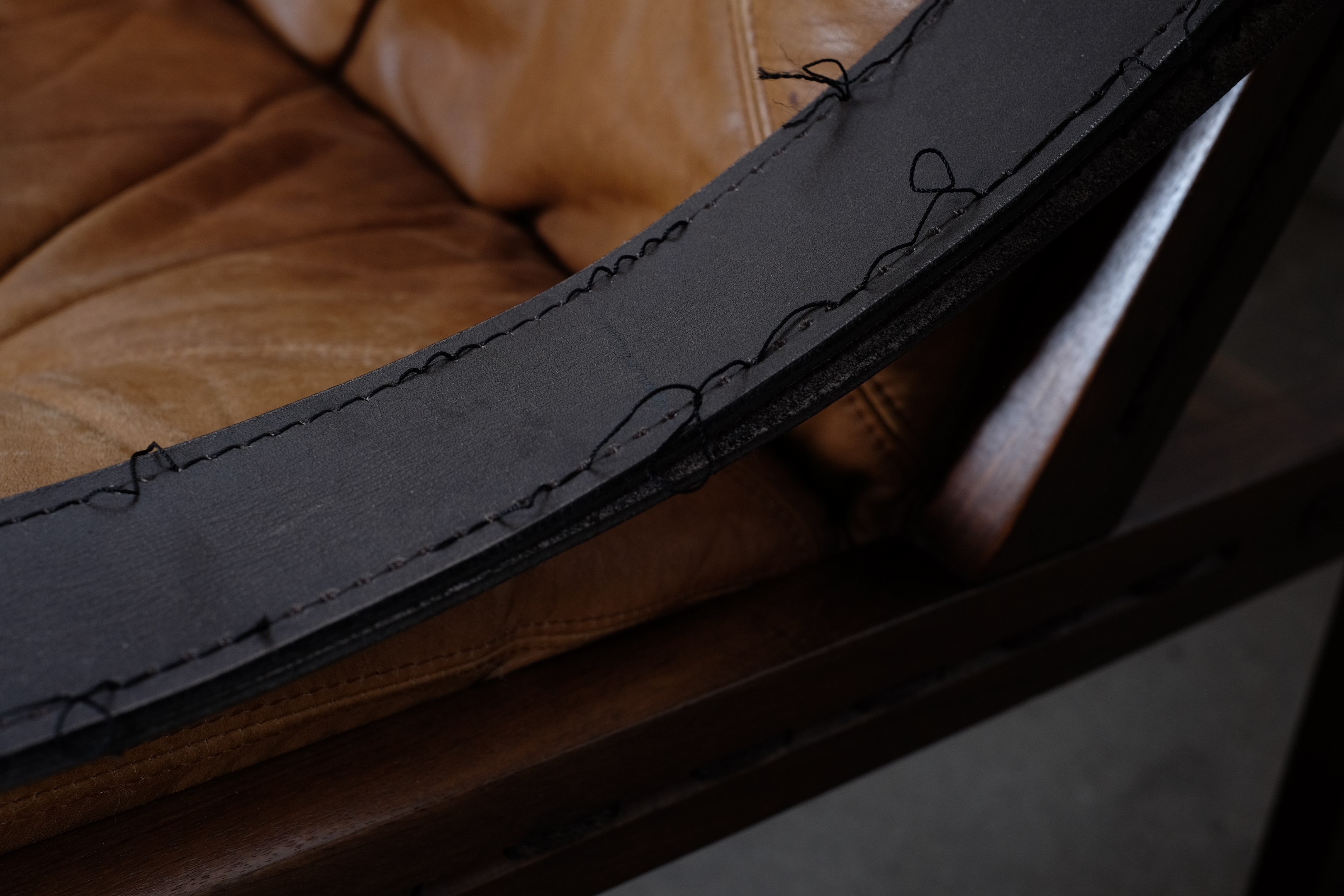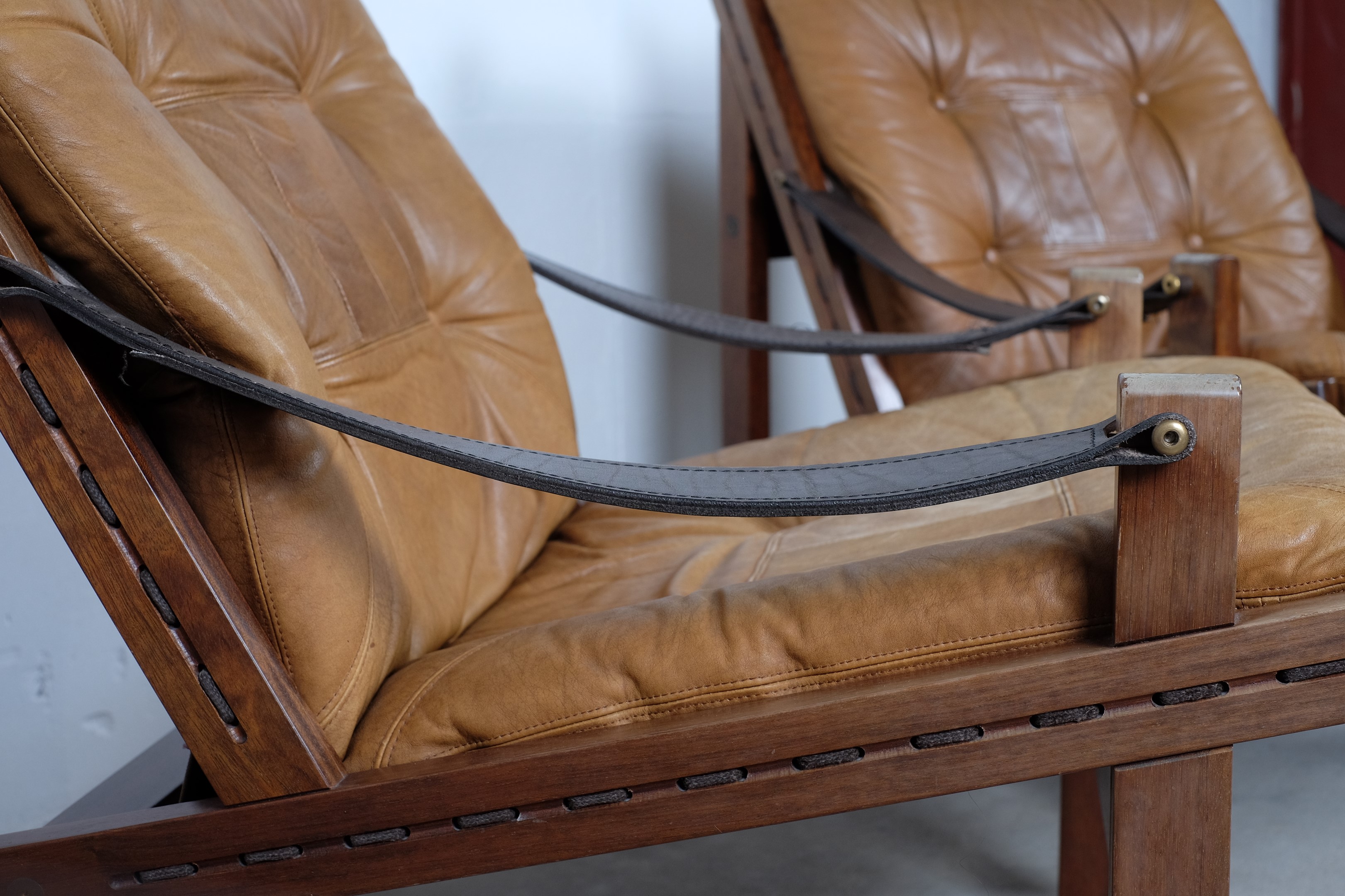 The chairs are in good but vintage condition, but some of the thick leather armrests needs to be sewed (look photo) I will get that done at a professional before shipping. The chairs will be sent disassembled otherwise you need to use 1stdibs shipping.