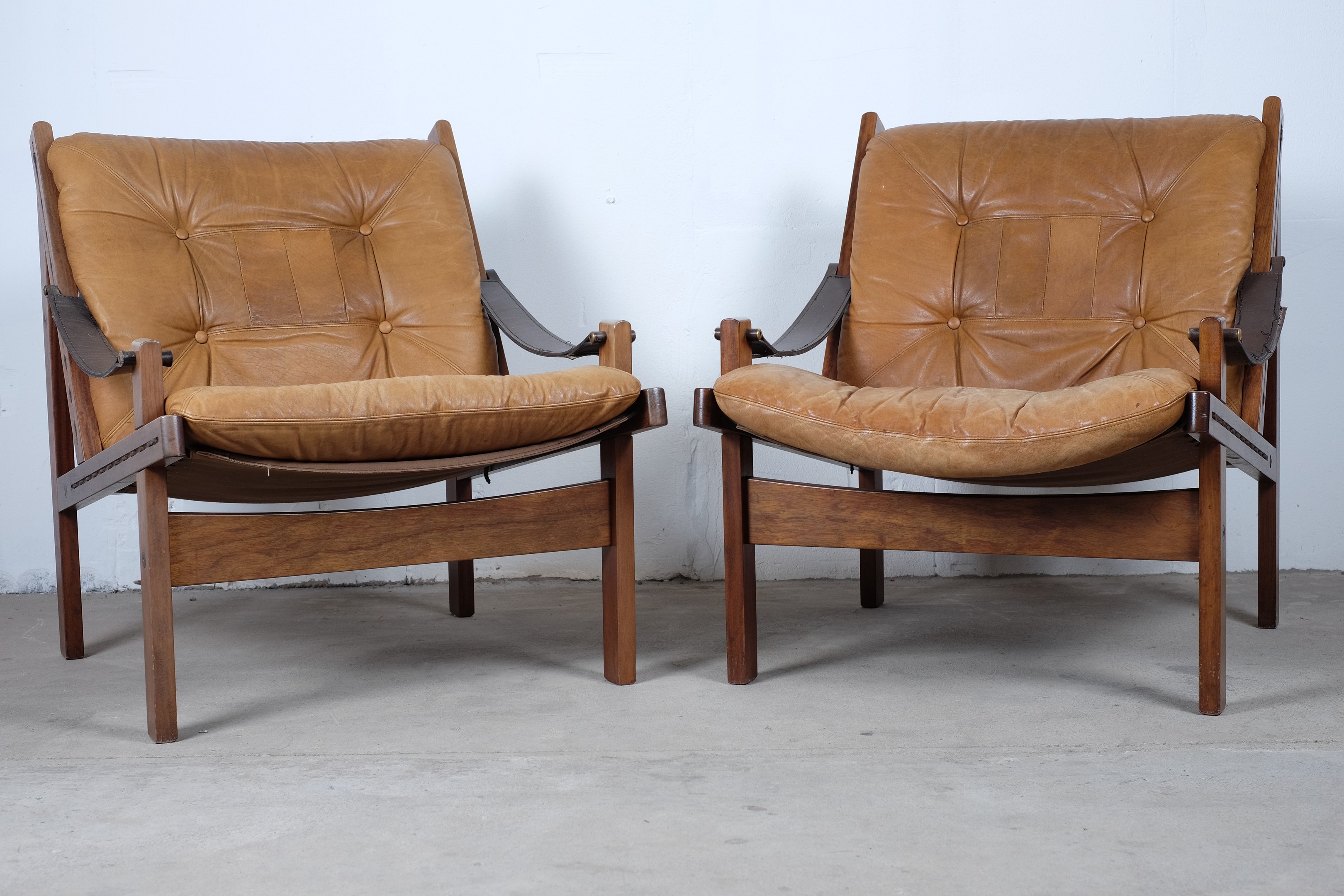 A matching set of three easy chairs two low back and one with high back, brown leather Hunter chairs designed by Torbjørn Afdal and manufactured by Bruksbo, Norway.