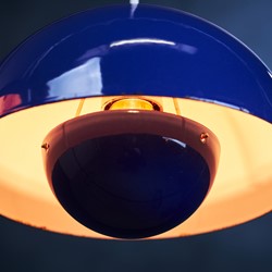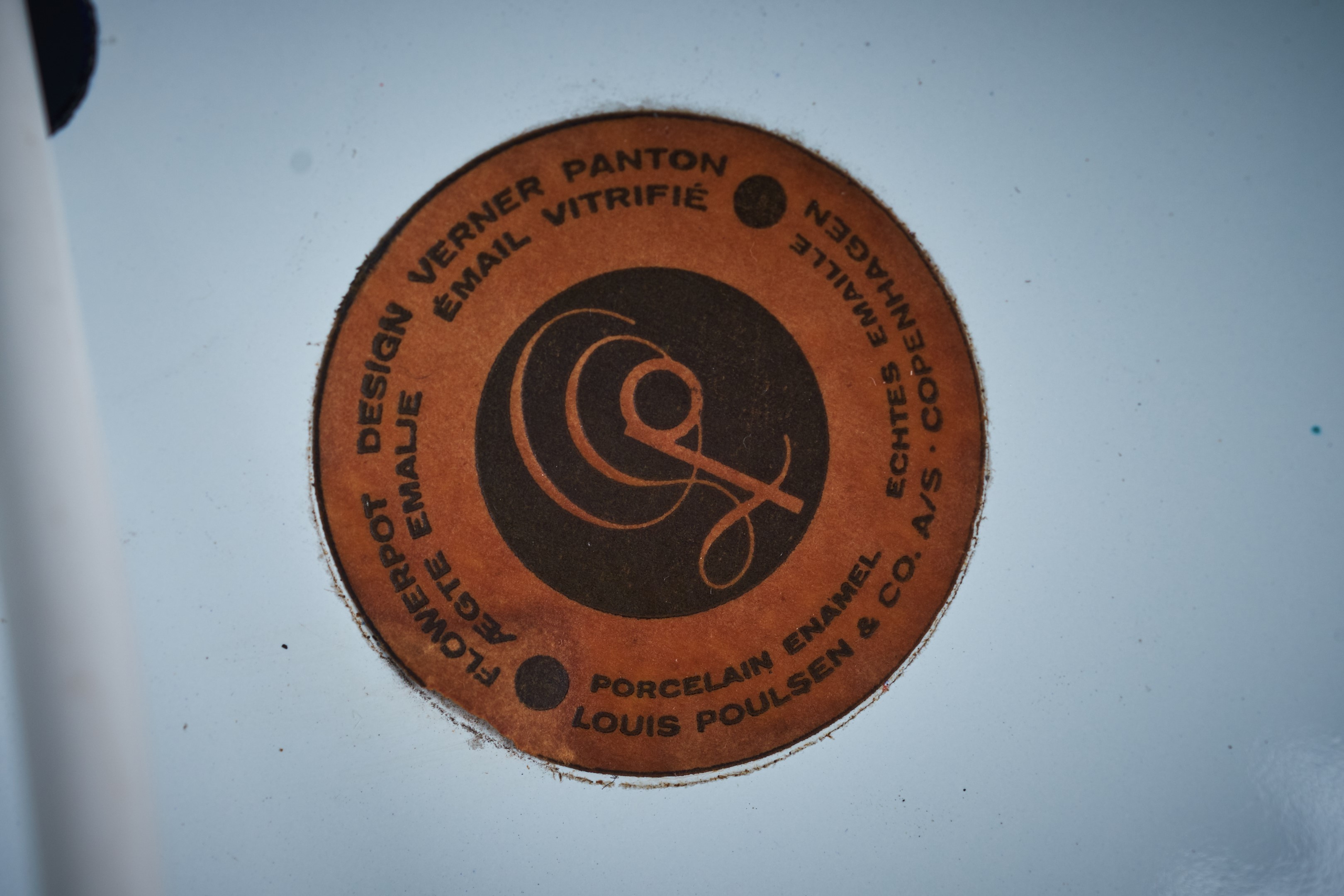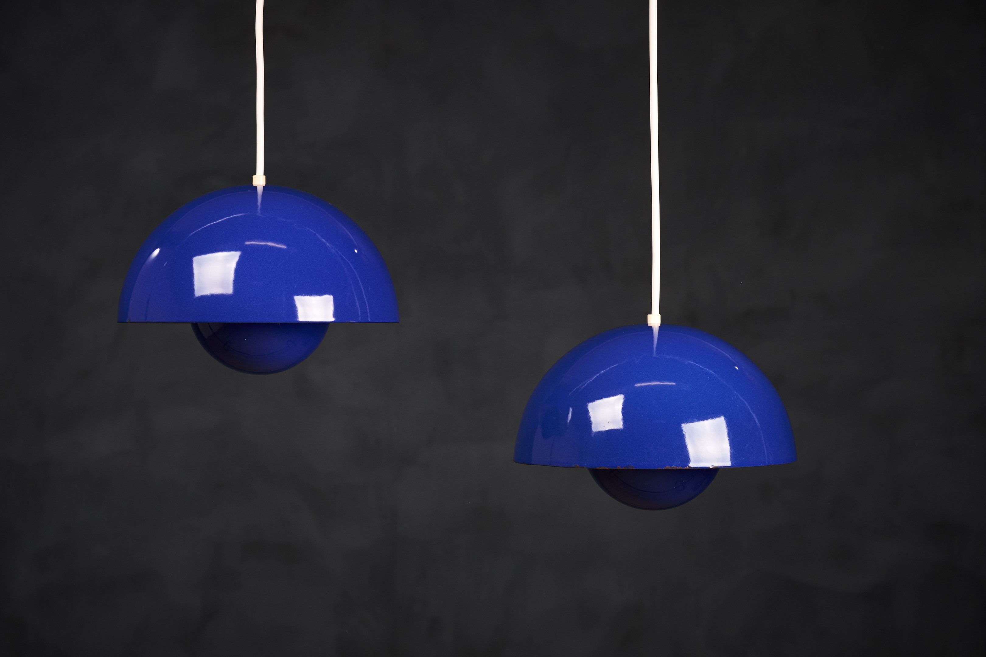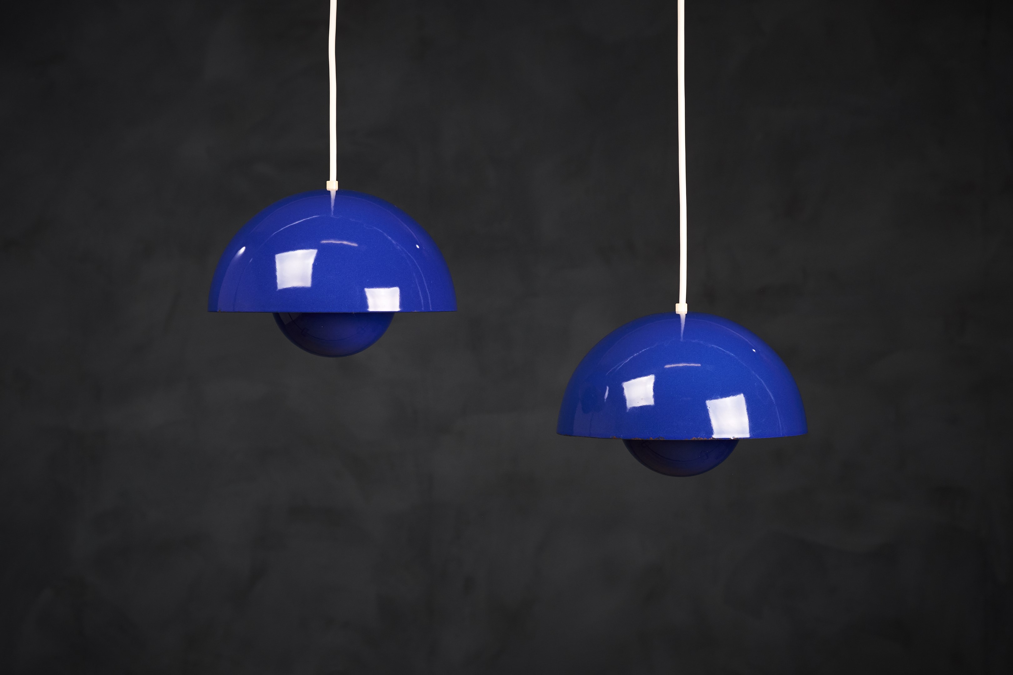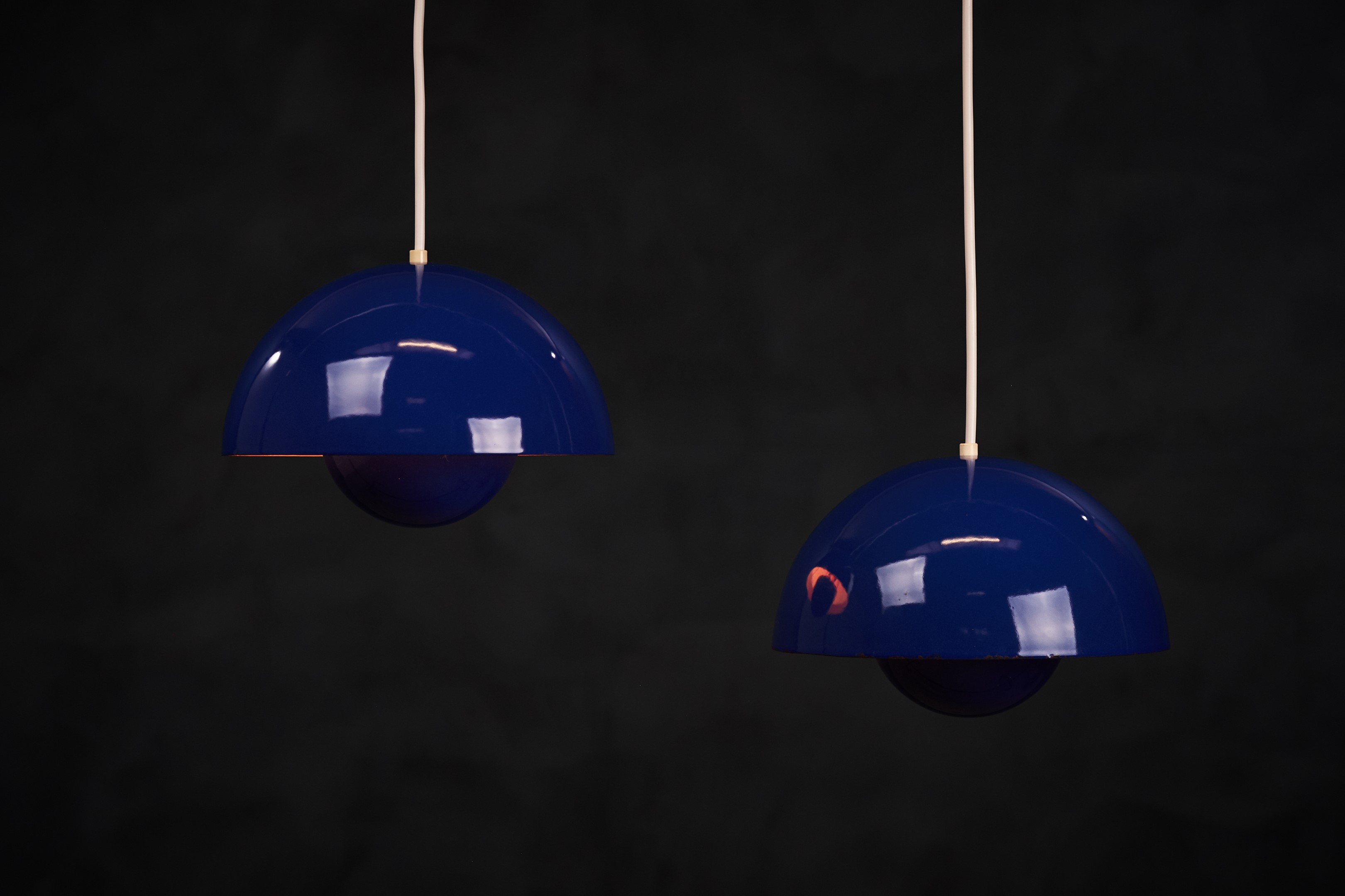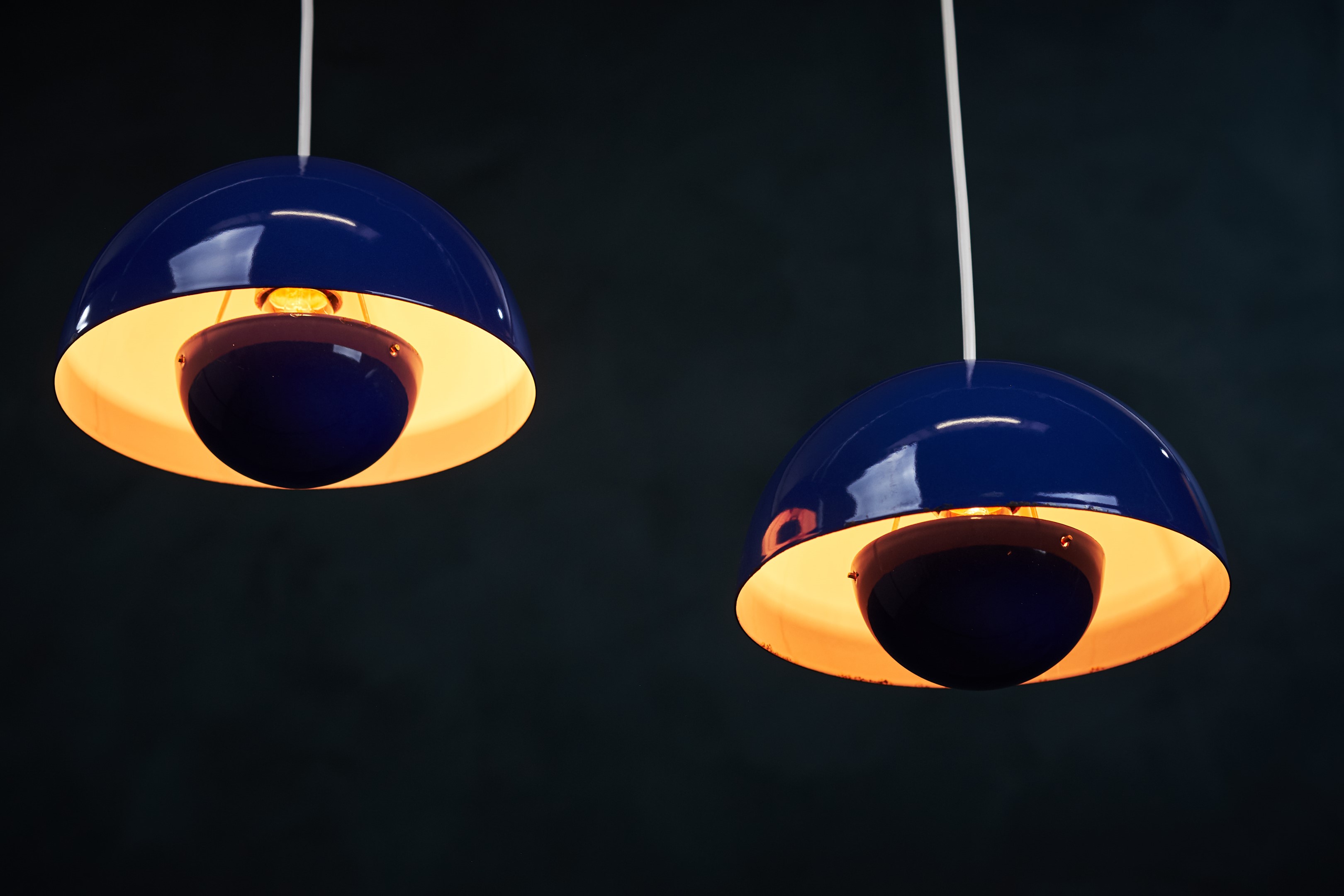A pair of original 1960s Louis Poulsen production of Verner Panton's classic late 1960s Flowerpot lamp in a rich glossy blue enamel finish with a bright lipstick-red interior to the bulb-shielding undercup, a detail that remains invisible in normal use except in the warm reddish tint it adds to the light cast by the lamp. The lamps is in superb vintage condition, with some small chips to the enamel, and retains both its original porcelain Louis Poulsen bulb holder and the unique original Flowerpot sticker to the interior. It would be a beautiful addition to any kitchen or dining table, or perhaps in a living space spreading a warm light. All original, but rewired with 2 m (6′ 6.7″) black fabric cord – for safety and beauty. Tested and fully functional. Cleaned, labeled and packed in protective plastic cover.