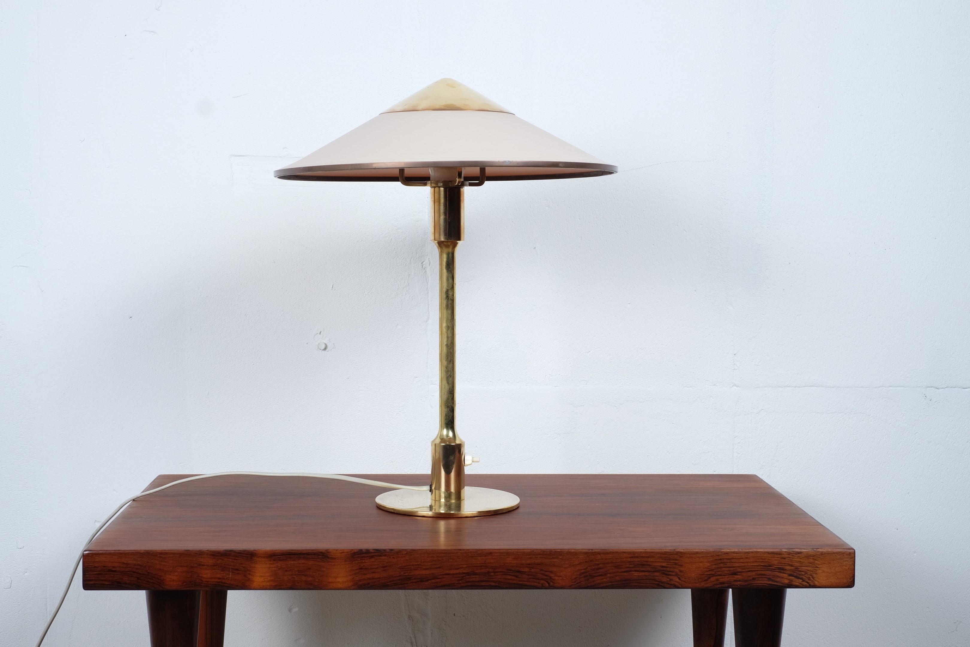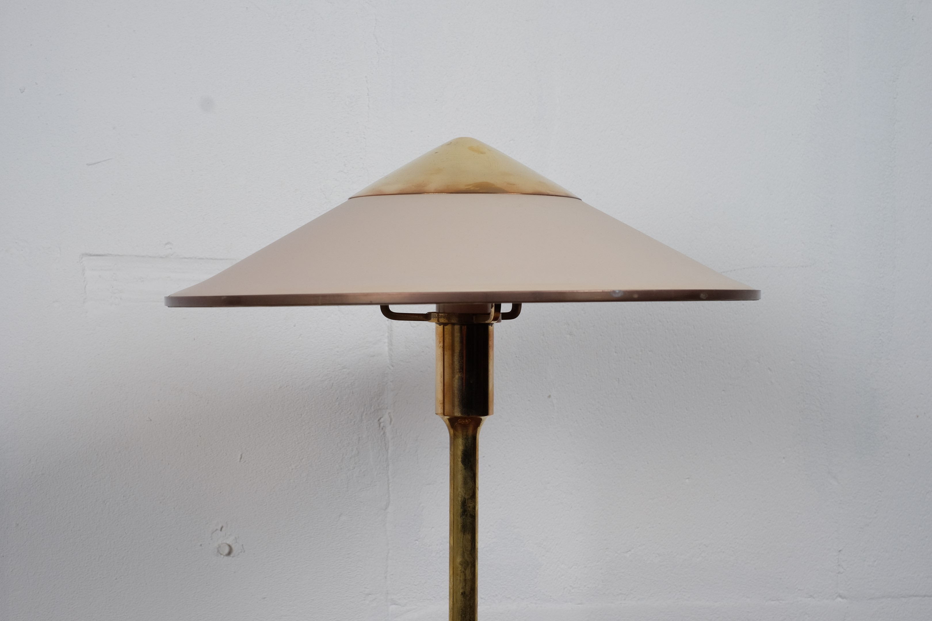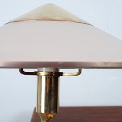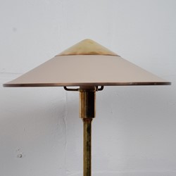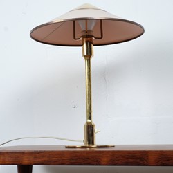 Kongelys (King) lamp was designed by Niels Rasmussen Thykier for Fog and Mørup in 1940s. The beautiful conical shade is original Bakelite with finial and shade rim in brass which is matching the circular base and cylindrical base column.
