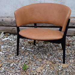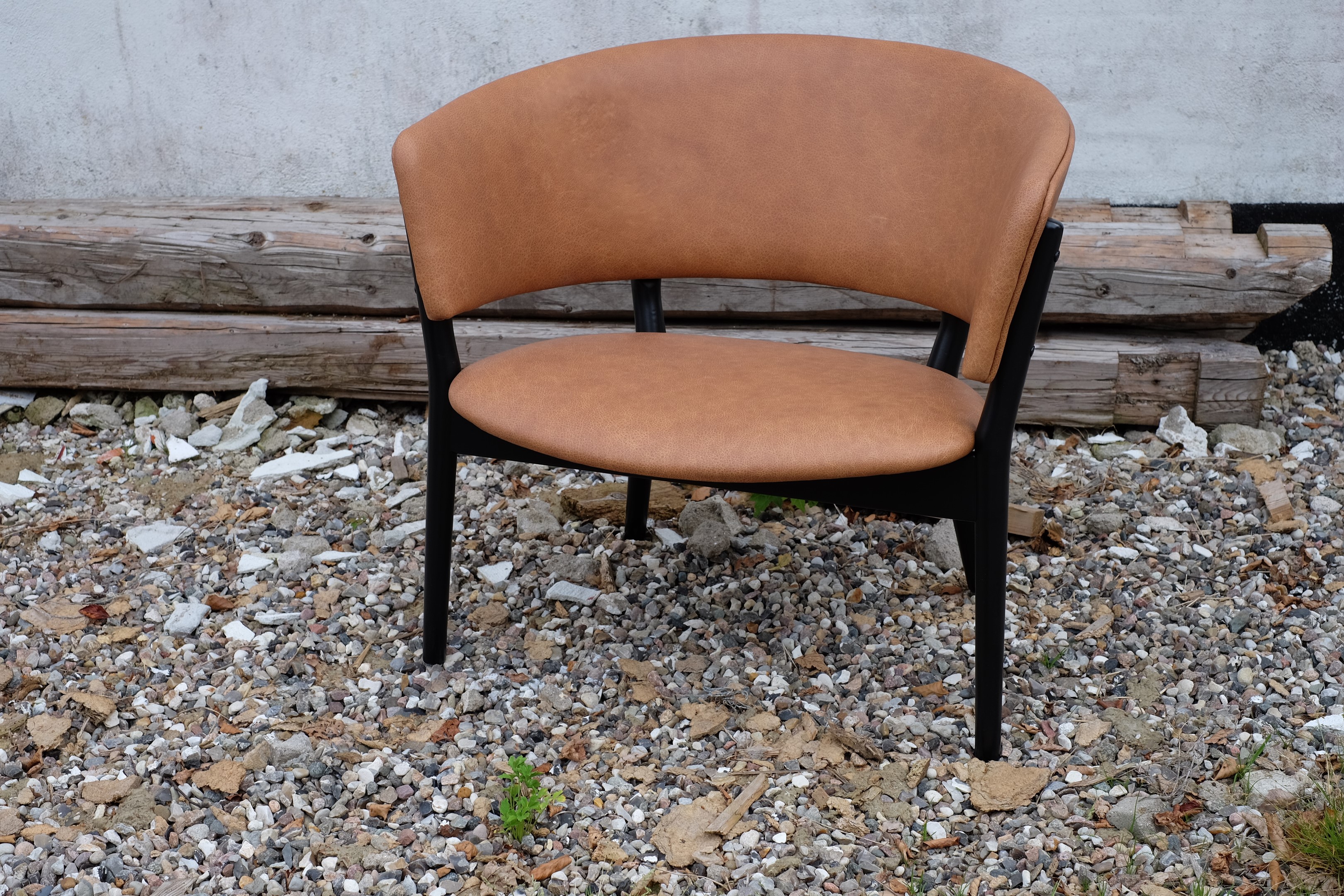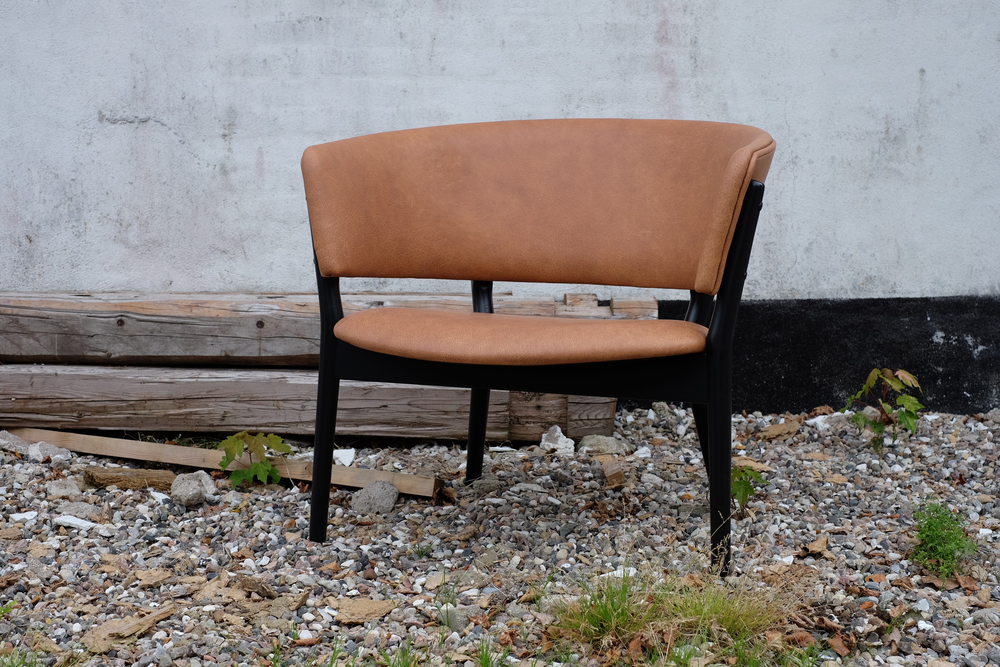This very beautiful Nanna Ditzel easy chair is newly upholstered with leather and freshly painted in black by a professional The chair was designed by Ditzel in 1952, manufactured by Søren Willadsen. (Model ND83), each leg is a single piece of timber which has been sculpturally shaped.