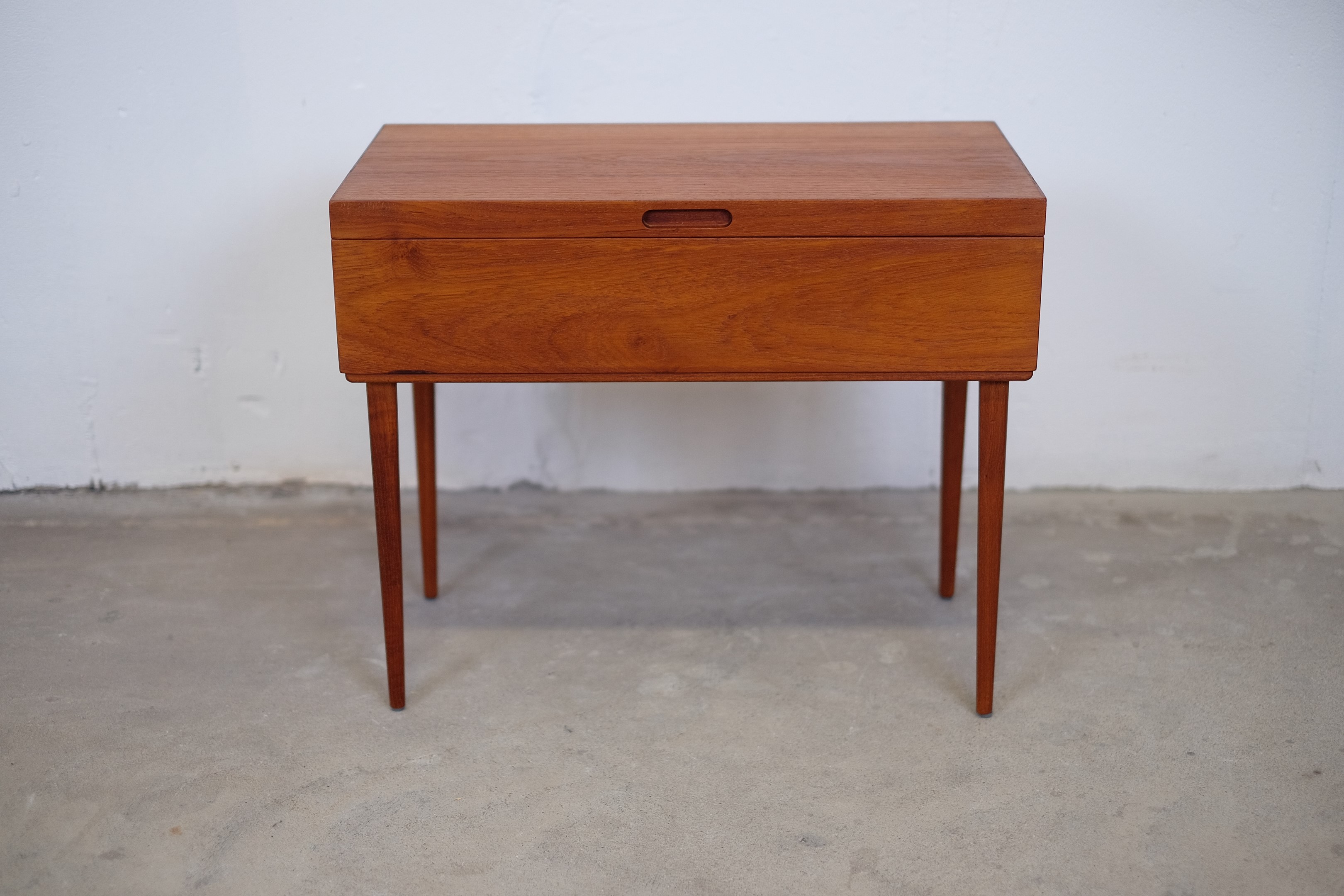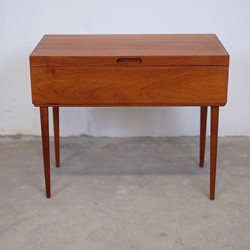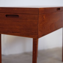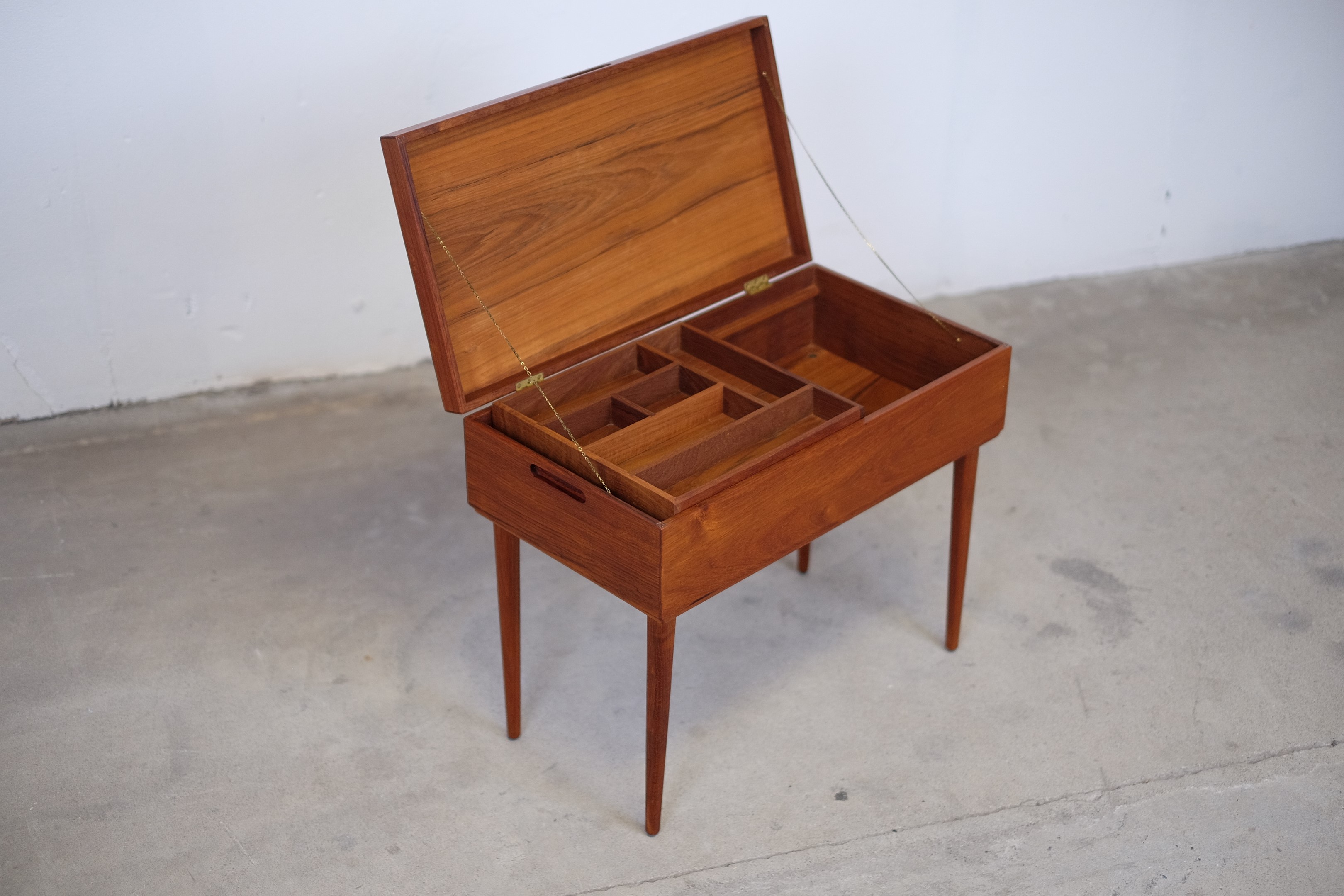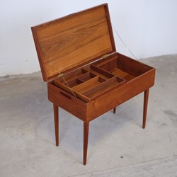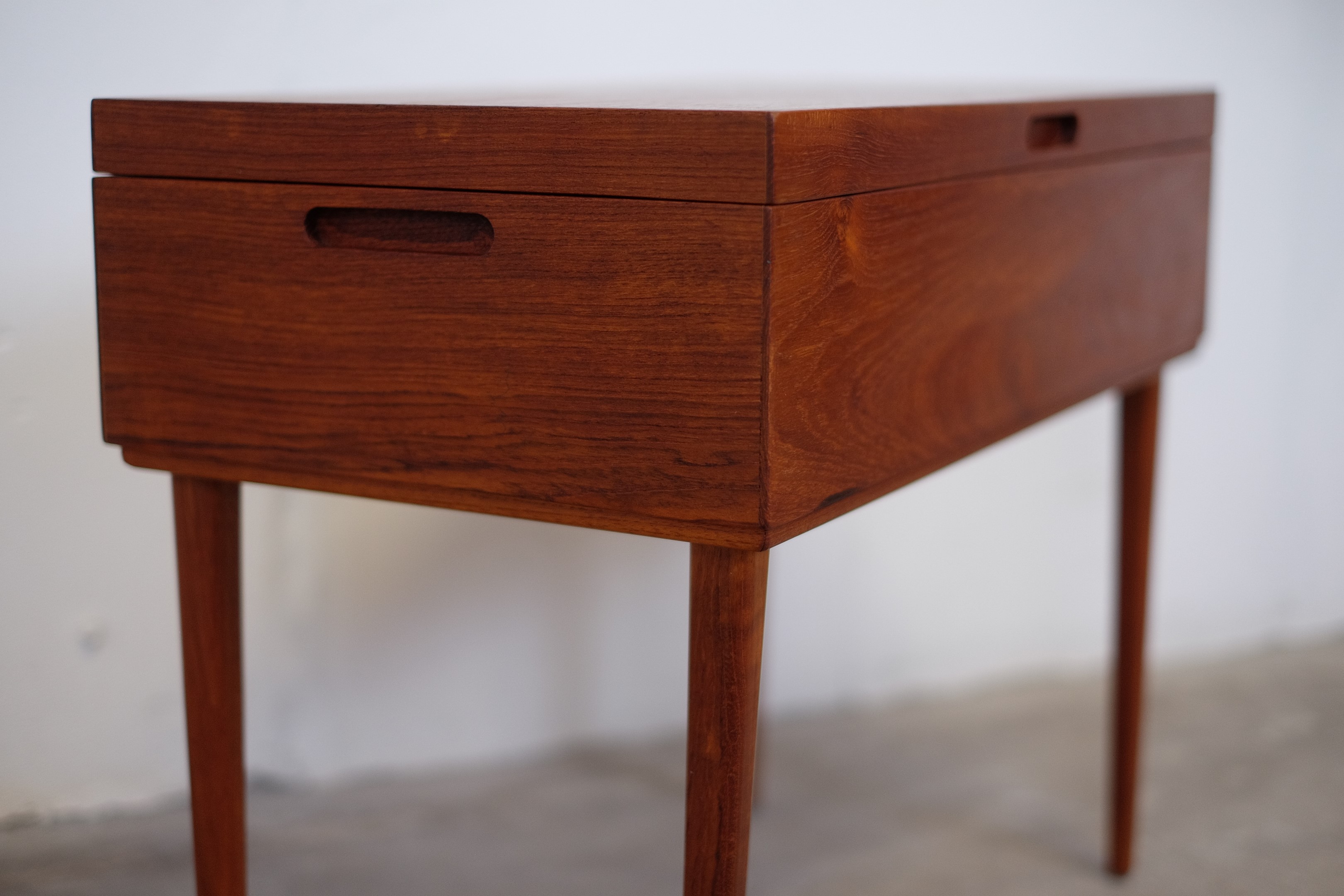 Sewing table in teak with small brass chains used as hinges and a small sliding drawer, also in teak. Very light and elegant, could be used as a sidetable or entry dresser aswell. The sewing table are in really good condition.