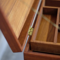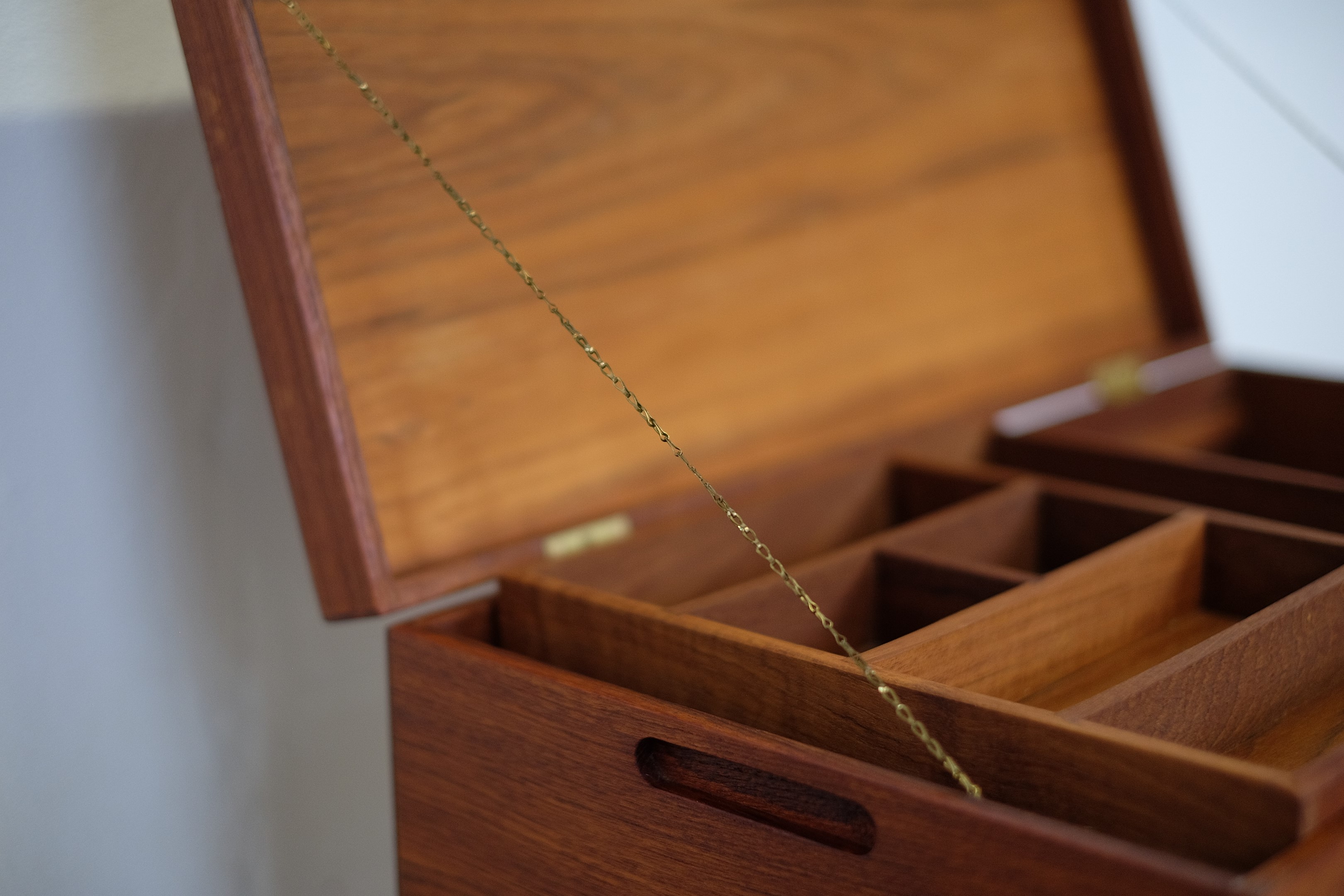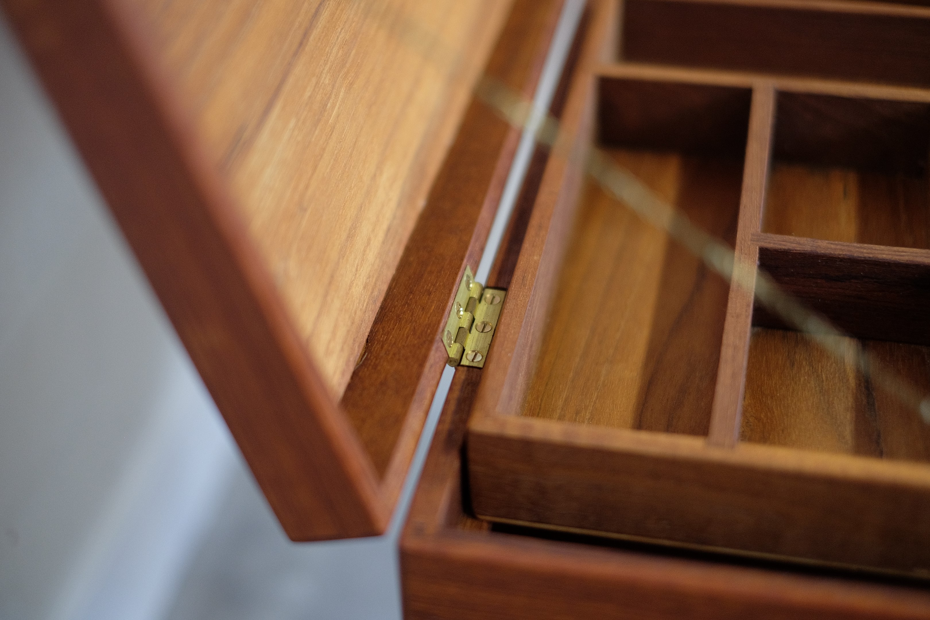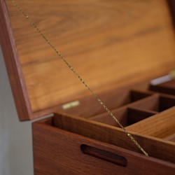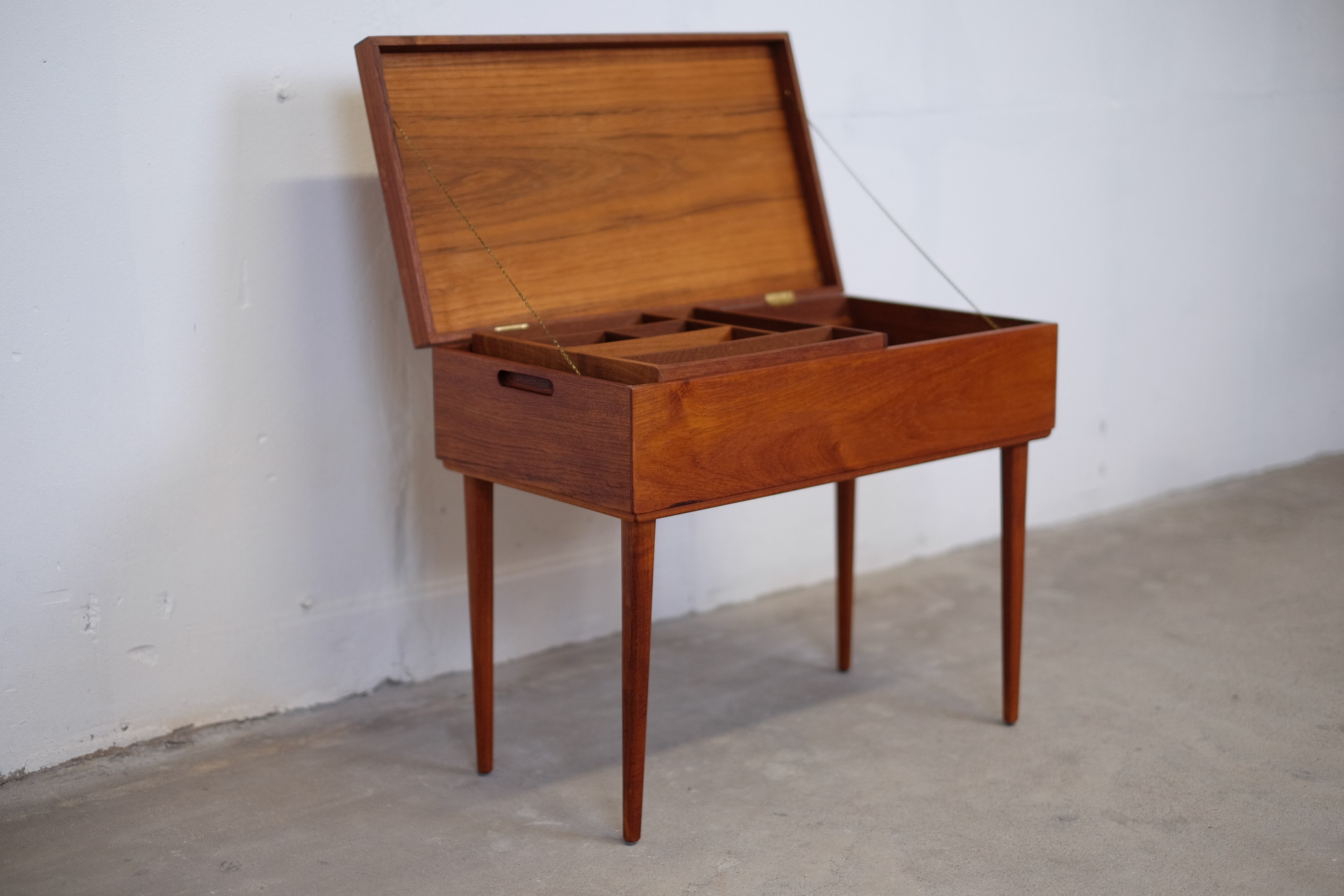 Sewing table in teak with small brass chains used as hinges and a small sliding drawer, also in teak. Very light and elegant, could be used as a sidetable or entry dresser aswell. The sewing table are in really good condition.