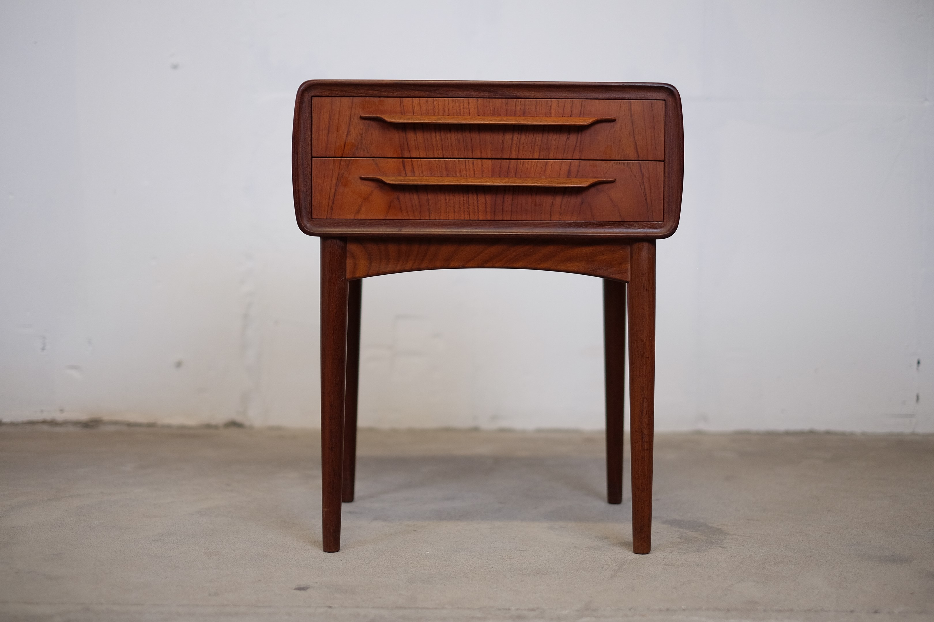 Stunning nightstands by the Danish designer Johannes Andersen. This 'cube'-shaped nightstands is made of teak with a teak frame It has two drawers with a molded edge. The nightstands are very beautiful and elegant, the workmanship and the quality are really expressed. These tables/dressers can be used for much more than just bedside tables. This is sure a very popular table and a very rare sight today. Both is in very good condition with few signs of age-related use and no big marks or scratches.
