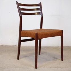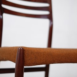 These beautiful chairs with slightly curved backrests has great seating comfort and a majestic expression that gives the chair everything we know Svend Aage Madsen best for. You can see the stamp in the chairs very weakly.