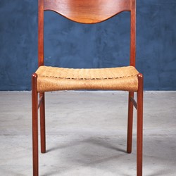 These chairs features solid teak frame with woven cord. The chairs are designed by Arne Wahl Iversen for Glyngøre Stolefabrik. These chairs have beautiful, refined details such as the curved seat sides and sculptural backrest.
