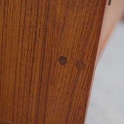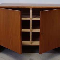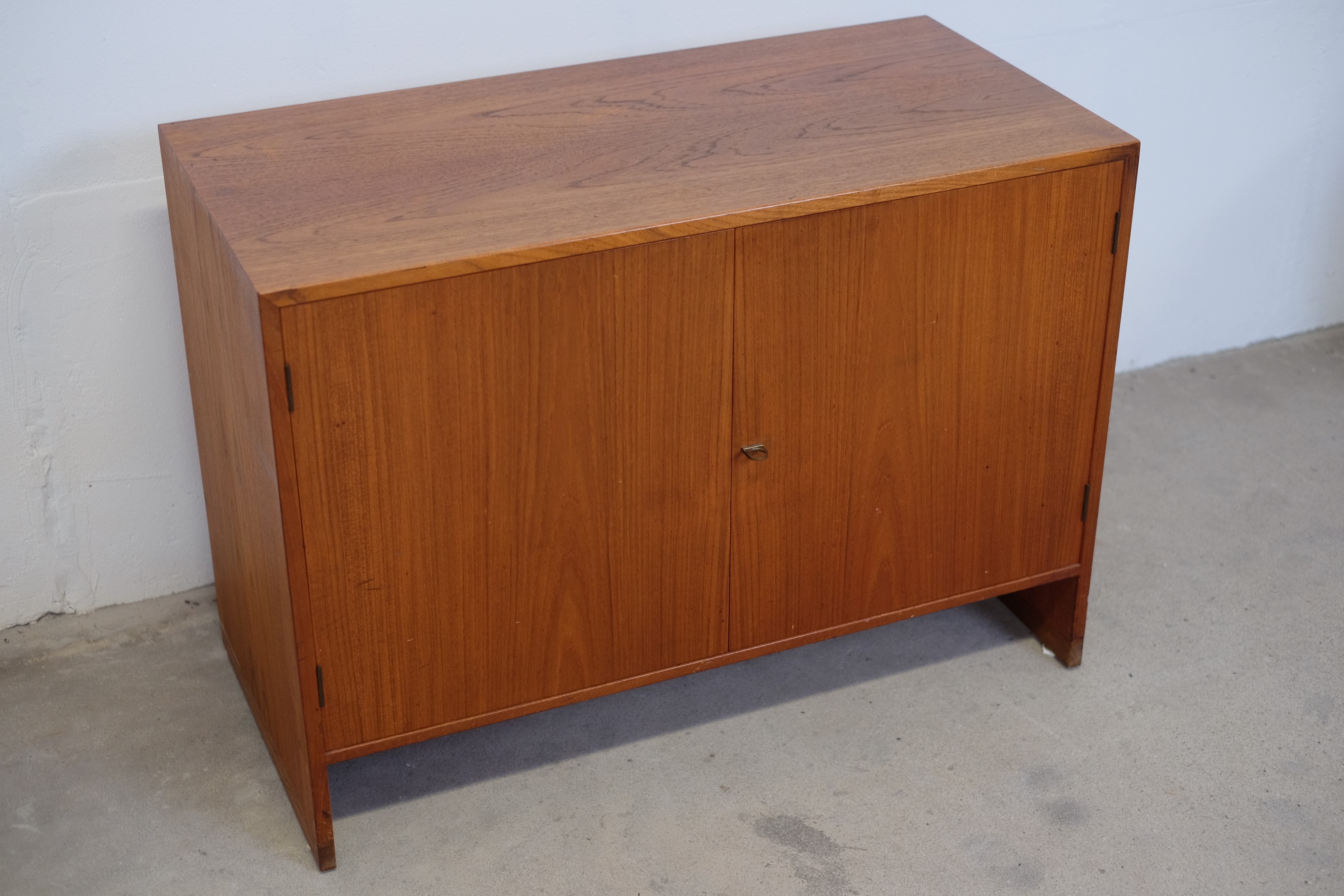 Teak sideboard or cabinet designed by Hans J. Wegner in 1956. The closet has two doors and four shelves with an elegant little brass handle to open. The furniture has a scratch here and there and a small chin or two, but nothing that does anything or interferes with the sight of the furniture. A nice patina after half a lifetime of use and still ready for at least half a lifetime more. And depending on the taste, there is always the opportunity to give it a new life if you like the authentic look (and that’s also one thing we can help with)