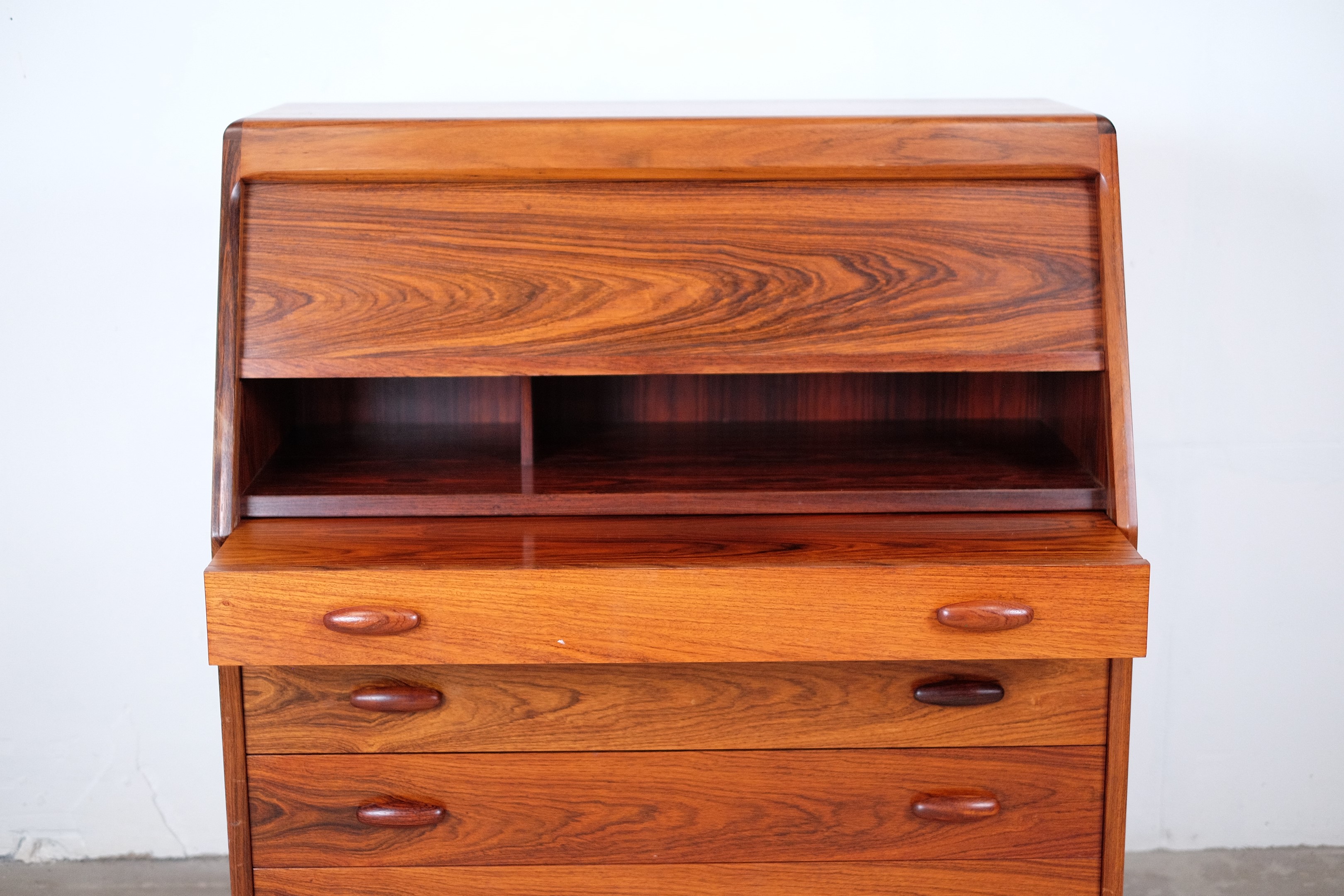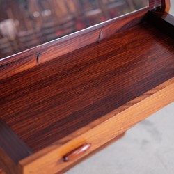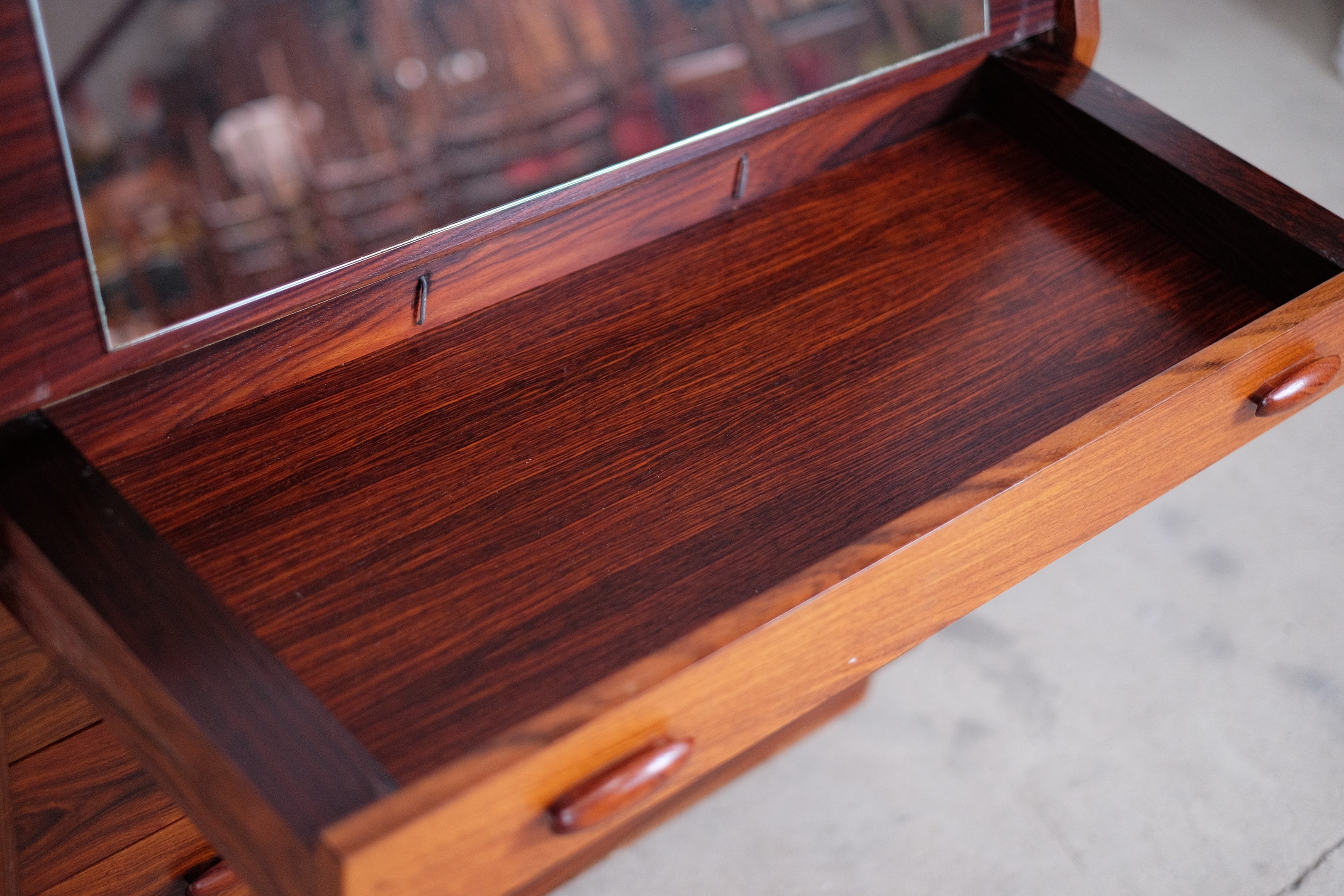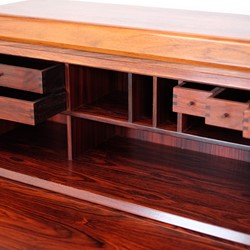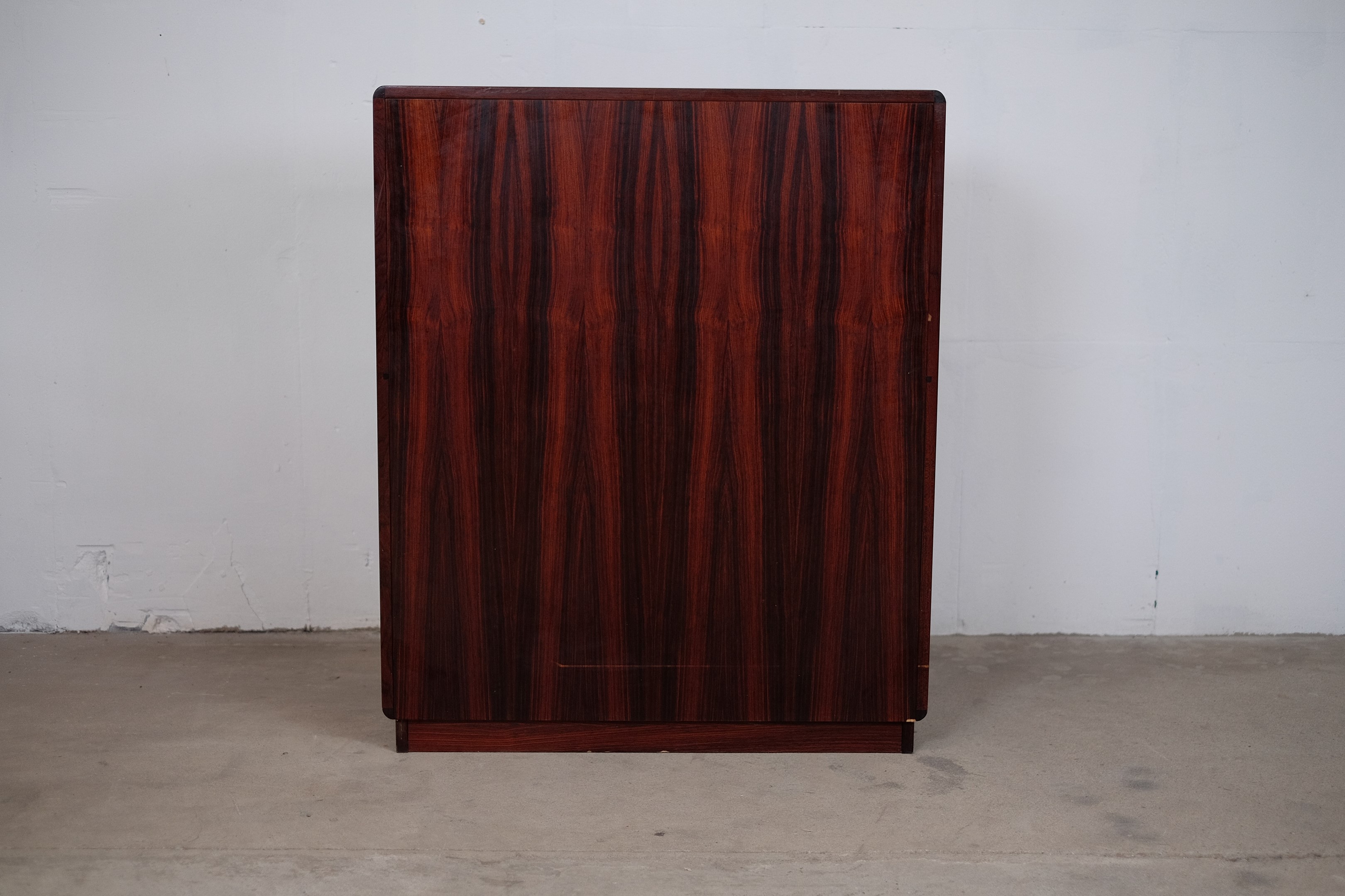 This incredible rosewood secretaire features an amazing wood grain and some excellent details. The top of the five large drawers conceals a hinged mirror. When opening this drawer, the cover of the front compartment rises mechanically. In addition, the secretaire has several smaller storage compartments and drawers.