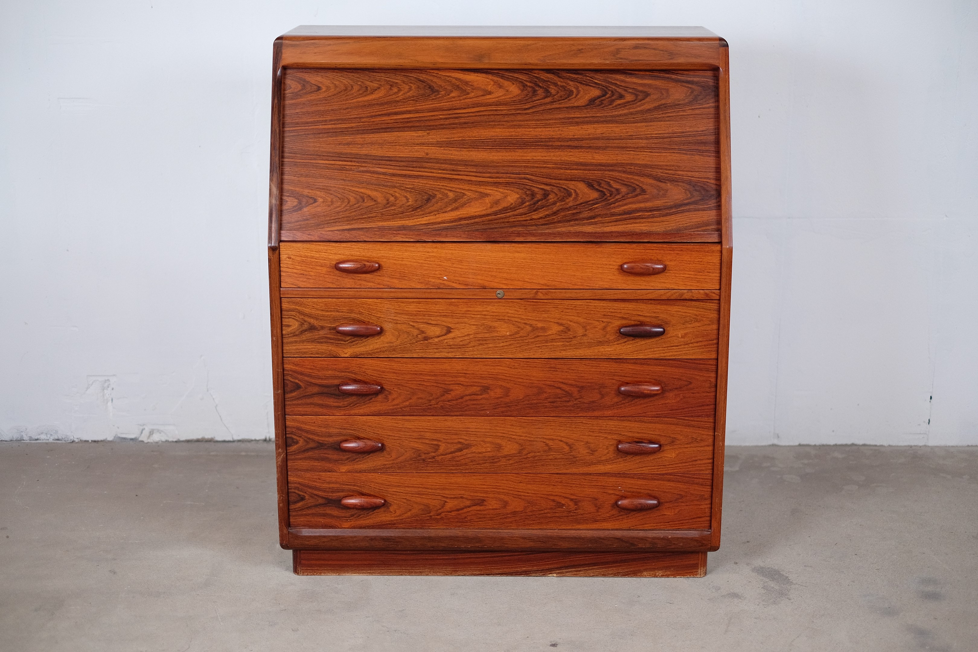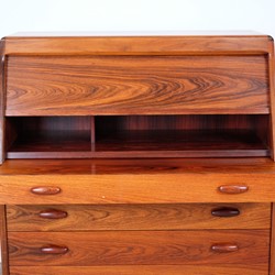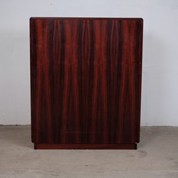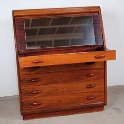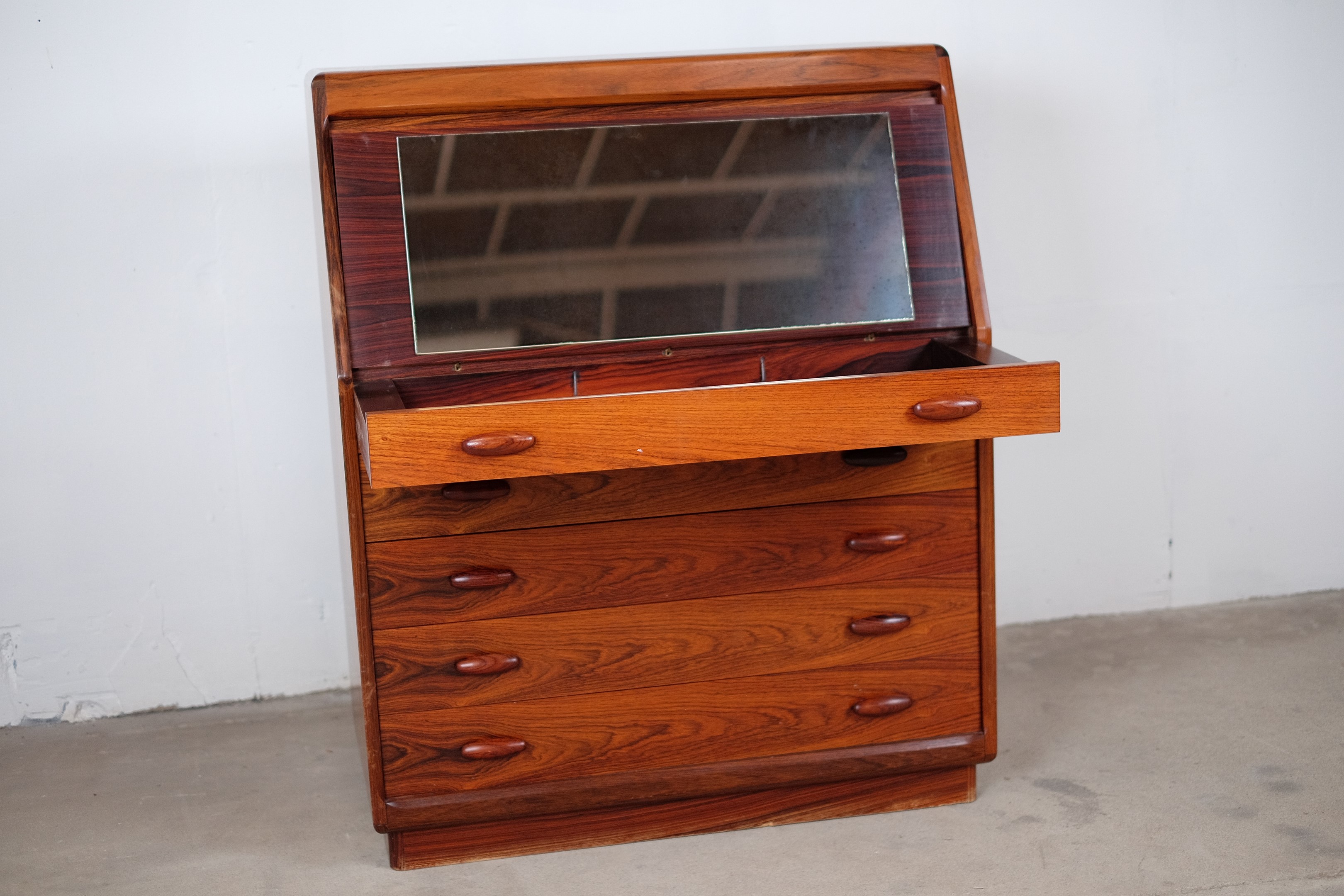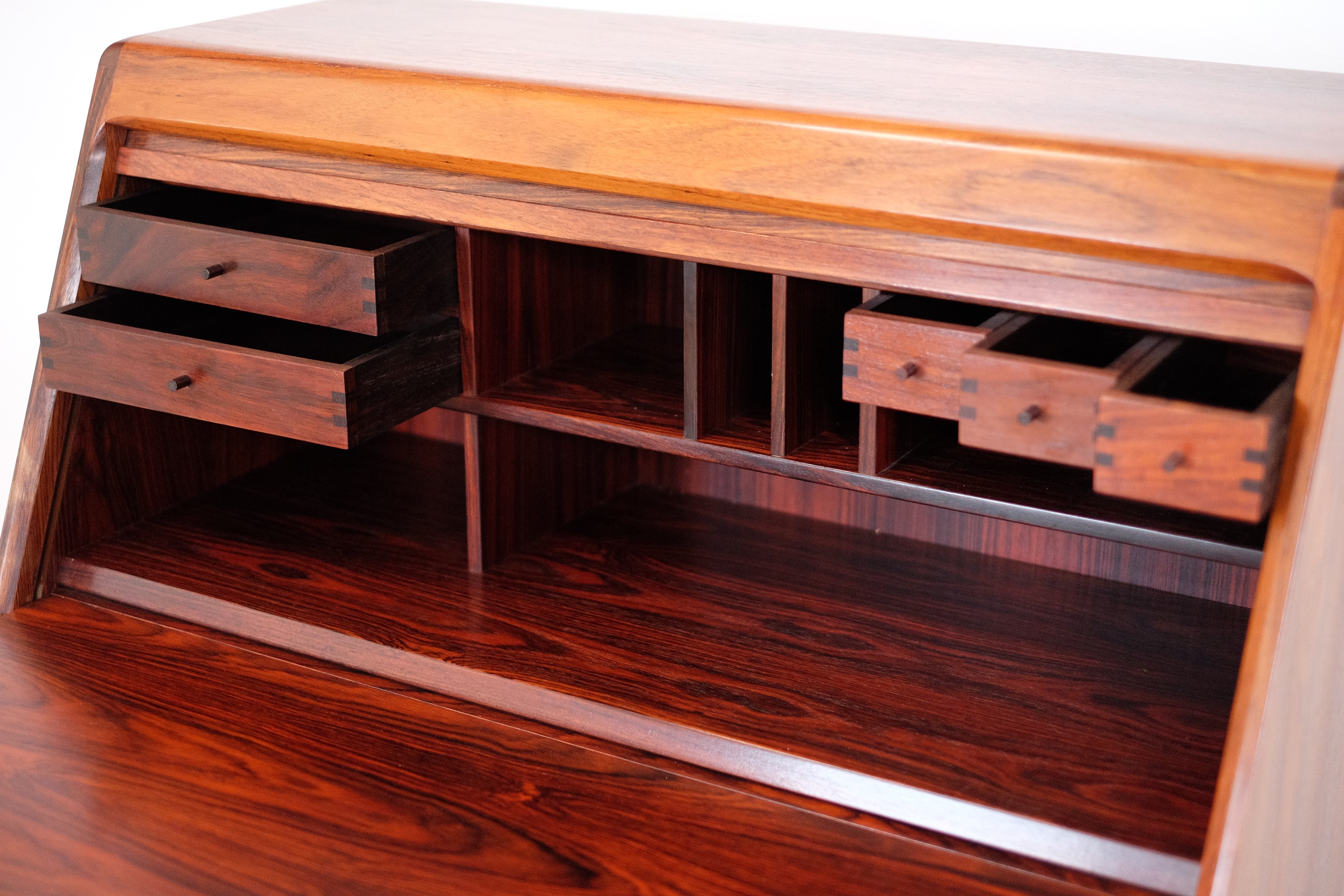 This incredible rosewood secretaire features an amazing wood grain and some excellent details. The top of the five large drawers conceals a hinged mirror. When opening this drawer, the cover of the front compartment rises mechanically. In addition, the secretaire has several smaller storage compartments and drawers.