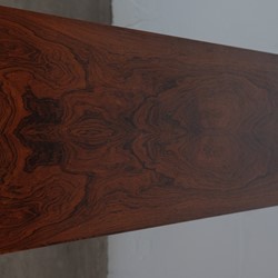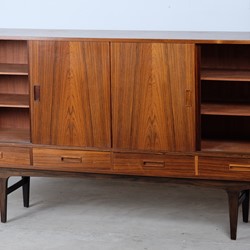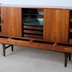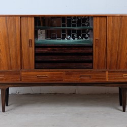 Look at this stunning piece. A rosewood sideboard designed and manufactured in Denmark. Finished in beautiful rosewood, with some amazing grains. Functionally, this cabinet has a lot of good storage room inside, with mahogany shelves on each side. One of the important things about this piece do you find behind the two middle doors, the bar. Rosewood is used to finish the shelves and three drawer fronts. In addition to storage inside, there are four drawers on the bottom section with more storage space. Solid rosewood legs.
