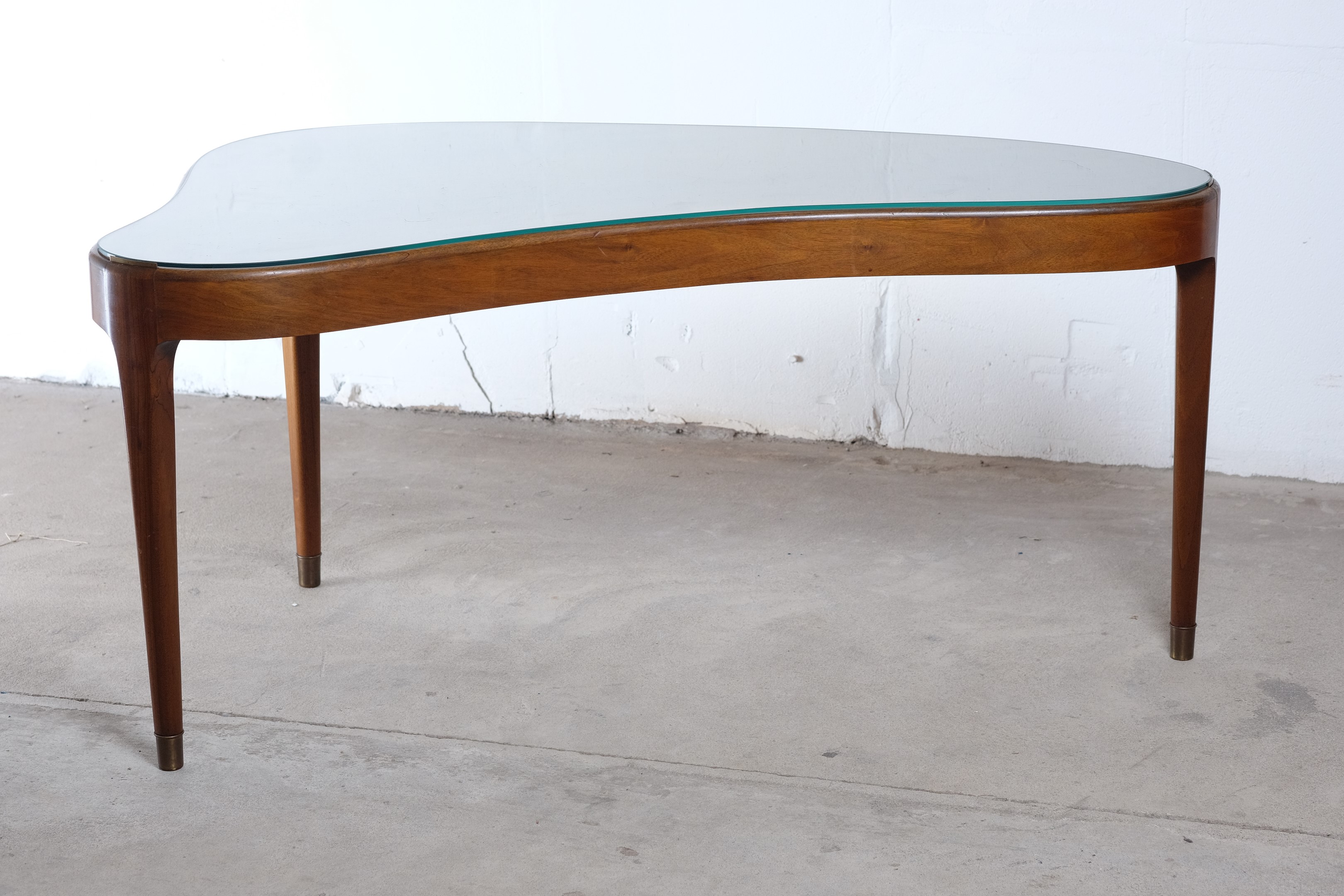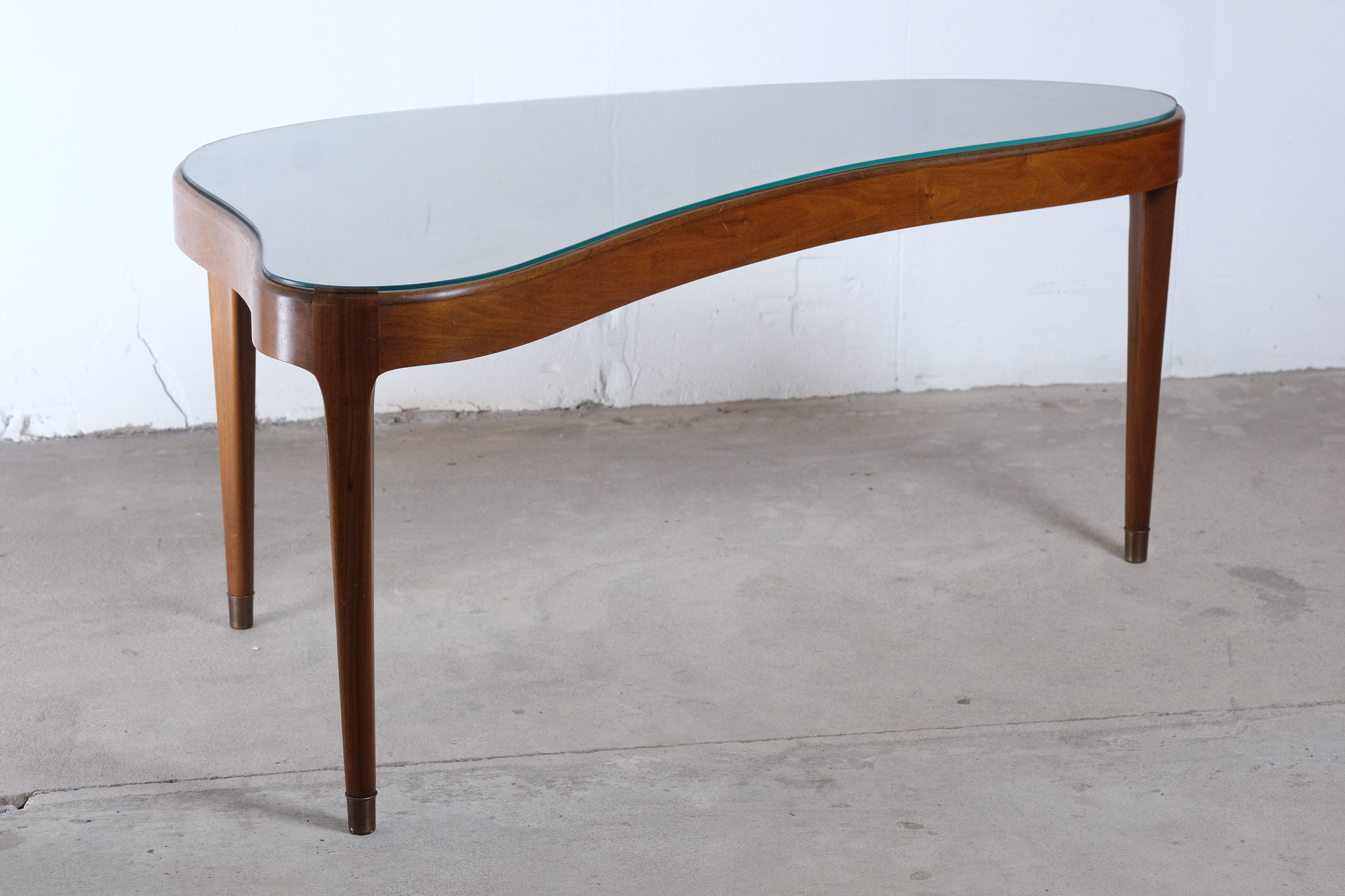 Organic shaped coffee table in nut tree with glass top and brass shoes.